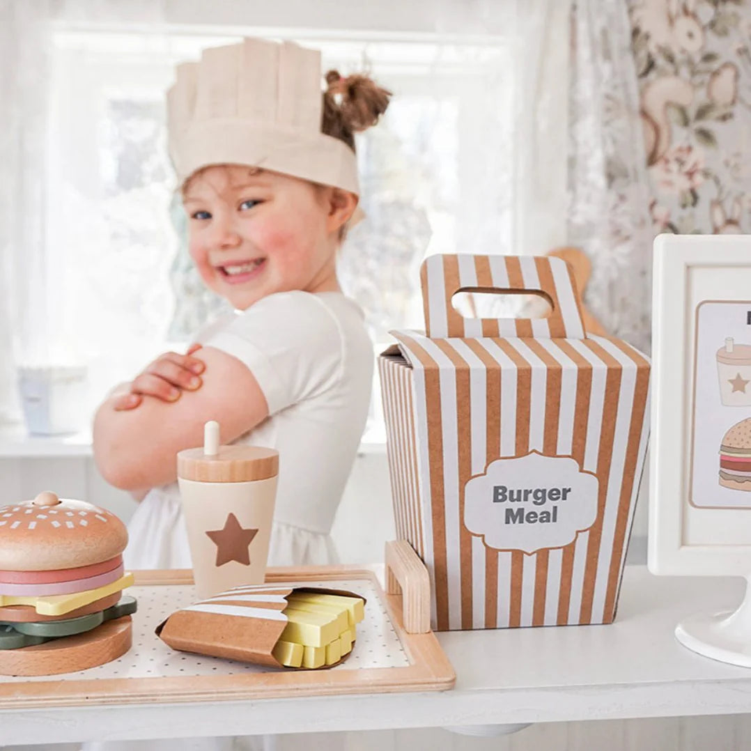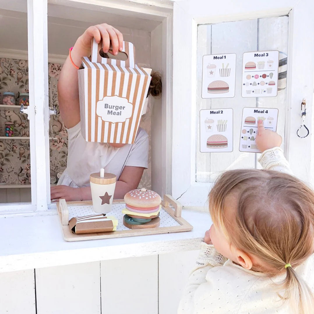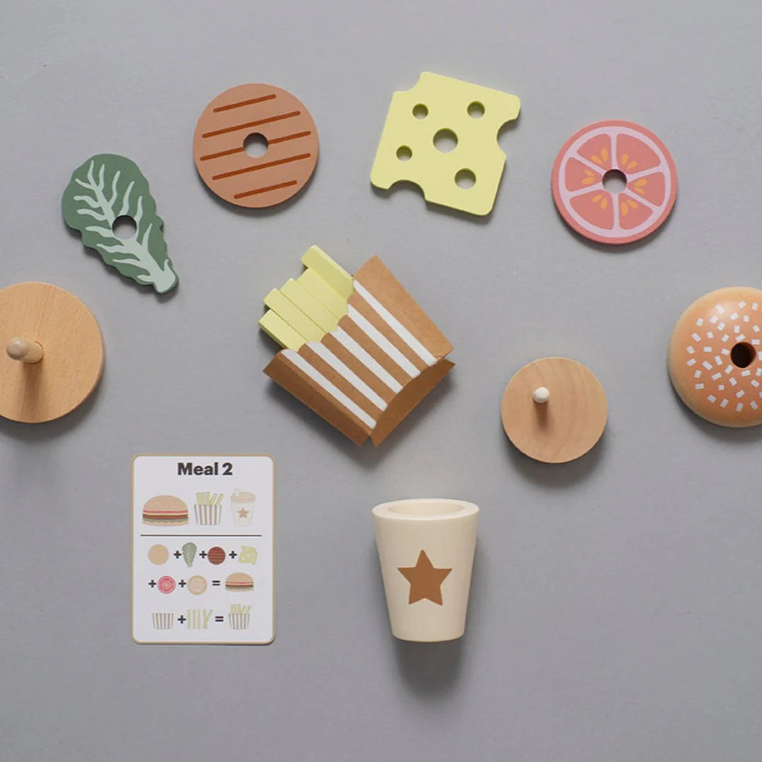 Met deze fantasierijke burgerset kan je verschillende smakelijke maaltijden serveren geïnspireerd door de bijgeleverde menukaarten. De burger is stapelbaar en het kind kiest zelf welke lekkernijen hij in elk menu wil opnemen. Vier menukaarten suggereren verschillende combinaties van de burger, de frietjes en het bijbehorende drankje. Alleen de verbeelding van het kind bepaalt de grenzen.