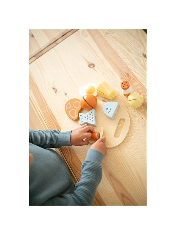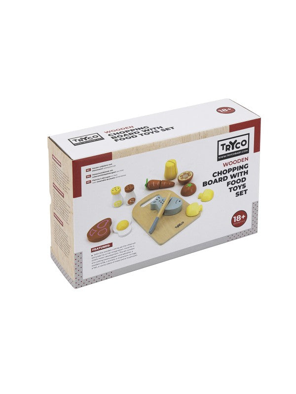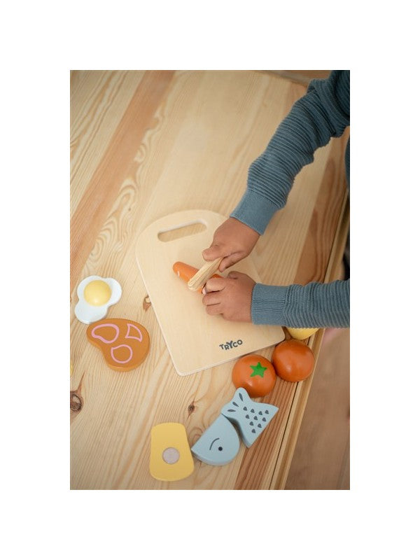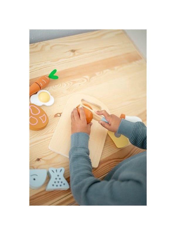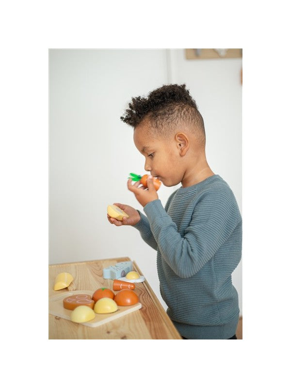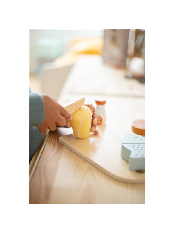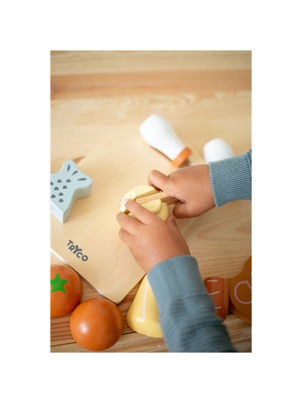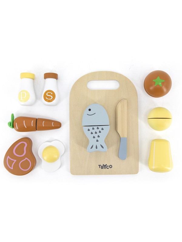 Met de houten speelgoed snij set van Tryco kan je kleine een lekkere maaltijd bereiden! De set bevat een vis, vleesje, tomaat, ei, champignon, wortel, paprika, een peper-en-zout stelletje, snijplank én een mesje. Met het mesje kan je kindje de groenten en de vis doorsnijden. Zo voelt hij/zij zich een echte kok!