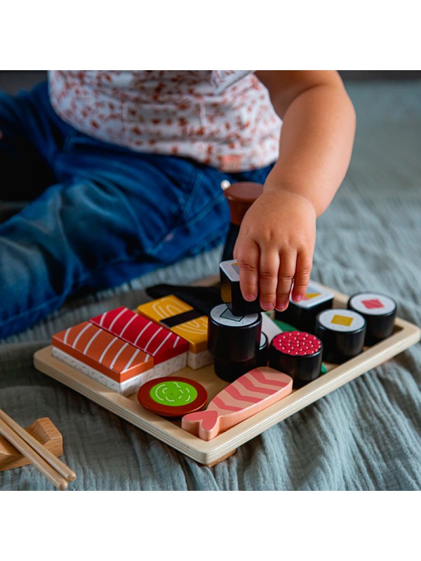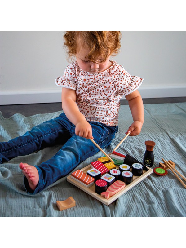 Wie kan deze luxe houten sushi speelset van Tryco nou weerstaan? Je kindje kan lekker sushi mee-eten aan de grote-mensen-tafel!