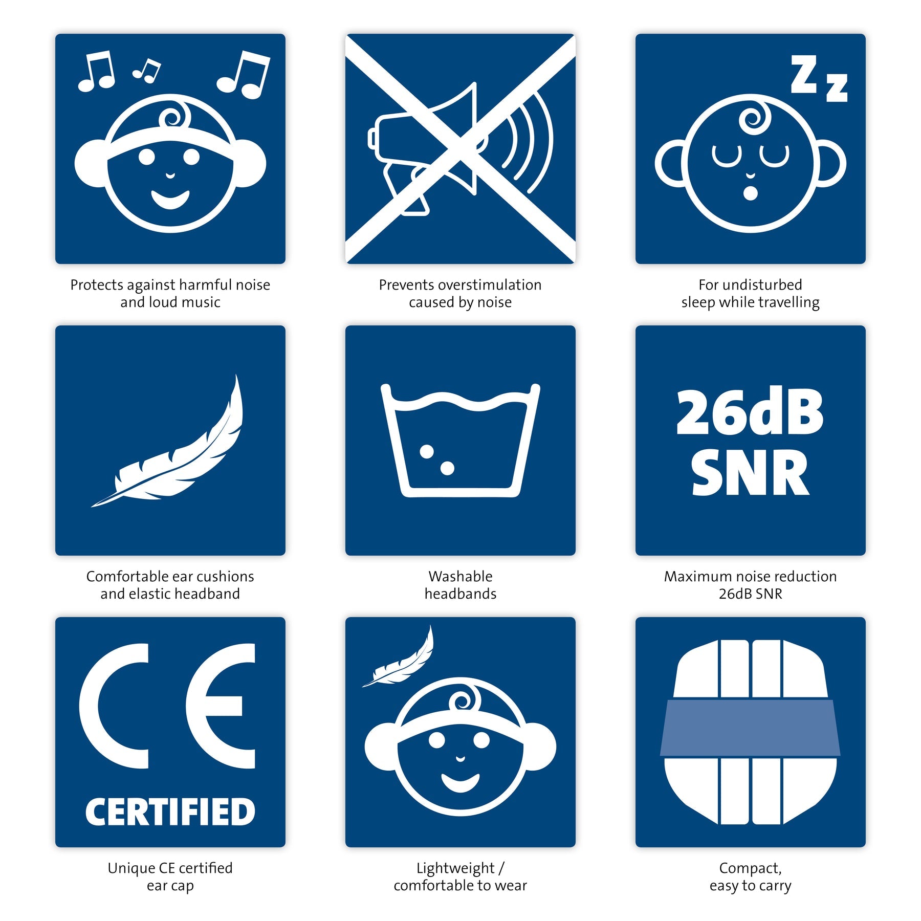 - De handige pasvorm in combinatie met de hoofdbandjes die standaard in twee maten worden meegeleverd maken de geluidsbescherming geschikt voor kindjes vanaf 12 maanden.