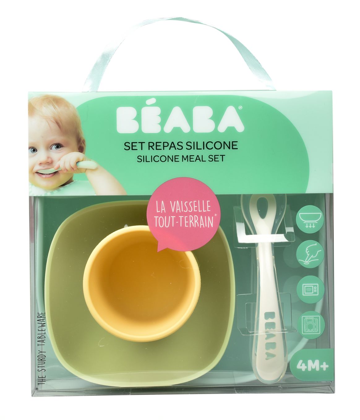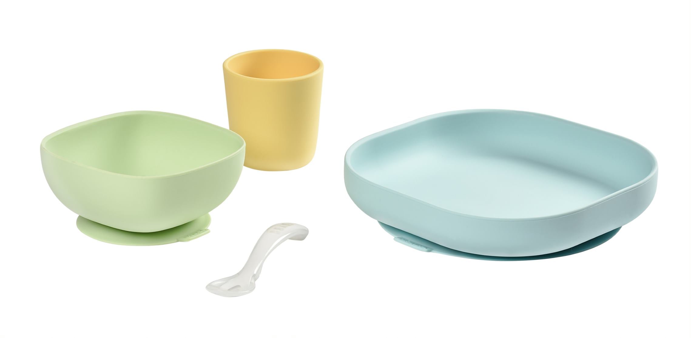 Zelf leren eten met het siliconen eetsetje met zuignap van Béaba! Dankzij de zuignap staat het bordje en kommetje stabiel op de tafel of de eetblad van de hoge stoel.
