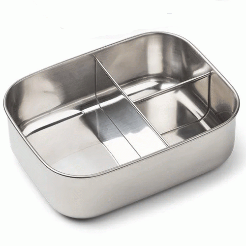 Lichte, duurzame brooddoos met vakjes in RVS en flexibel deksel in silicone. Roestvrij staal is een geweldig materiaal voor het bewaren van voedsel aangezien het geen kleuren, smaken of geuren opneemt. De doos is verdeeld in 3 handige compartimenten. Dit motiveert om een gevarieerde lunch samen te stellen.