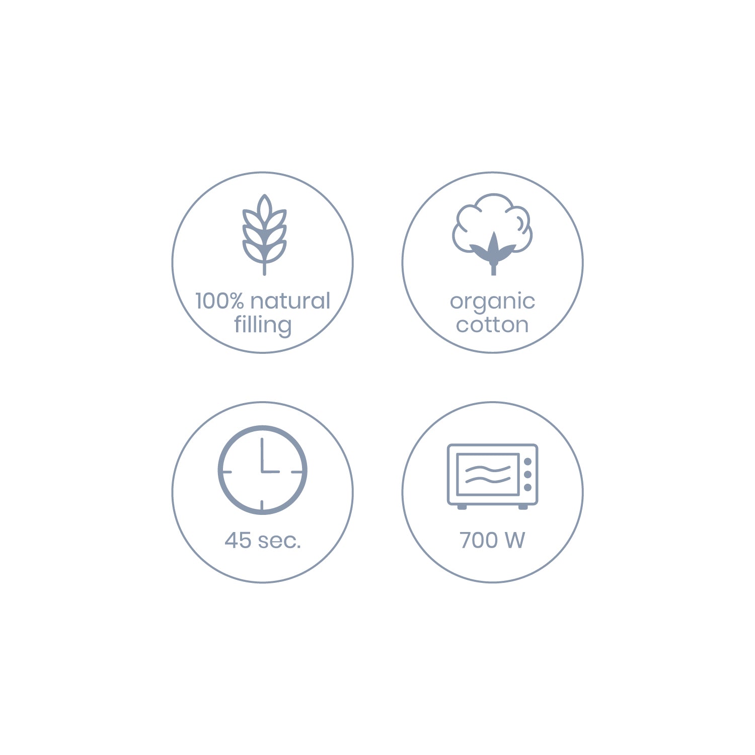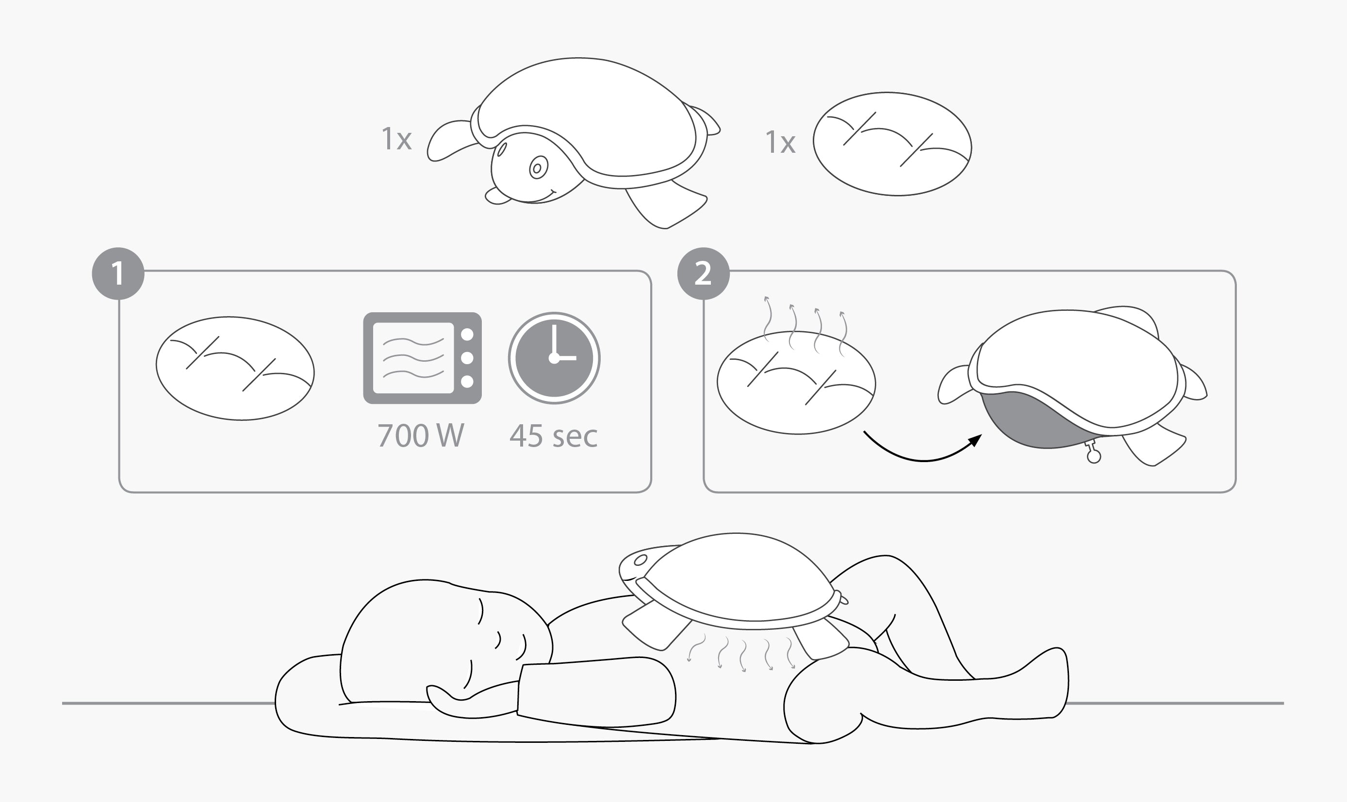 Verwijder het binnenste warmtekussentje uit de knuffel en verwarm het samen met een glas water gedurende 45 seconden in de microgolfoven op 700 watt. Haal het kussentje uit de microgolfoven en controleer de temperatuur. Als het kussentje nog niet warm genoeg is, kan je het nog eens 15 seconden in de microgolf verwarmen.