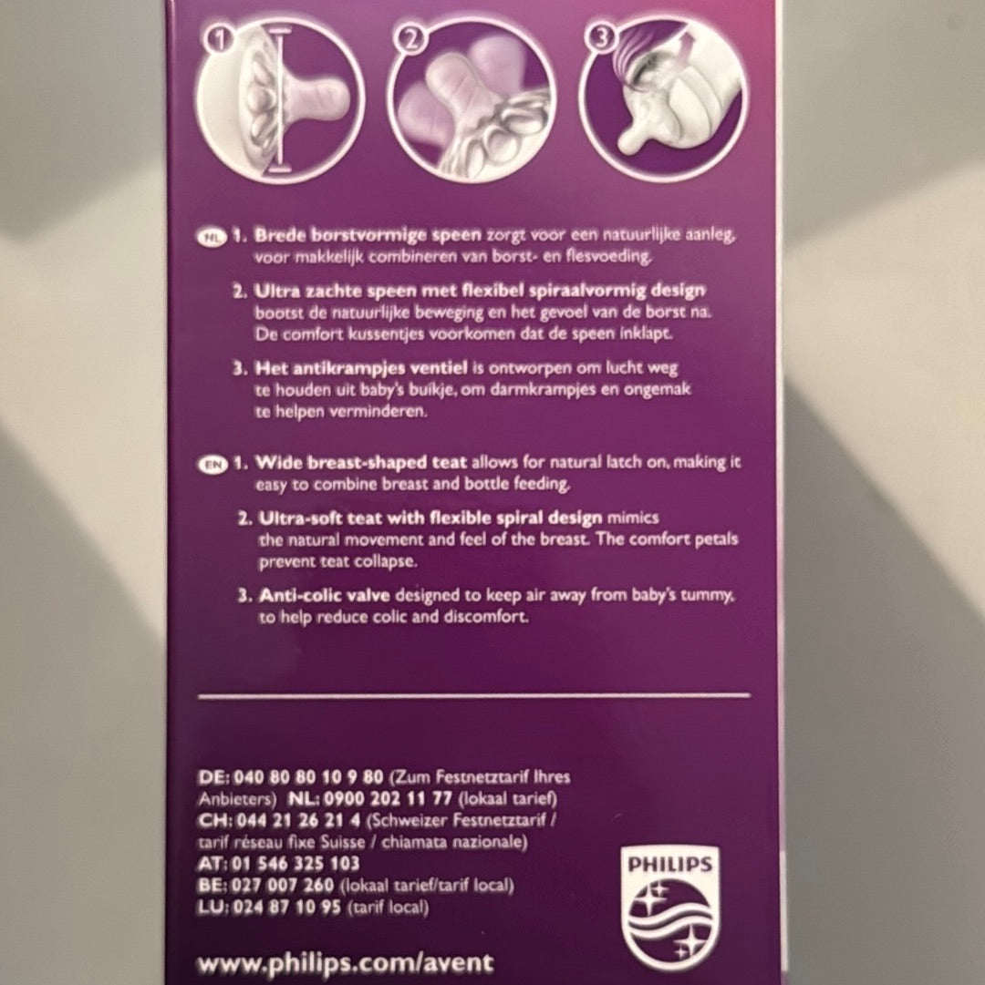 Onze Natural-fles met ultrazachte speen lijkt meer op de borst. De brede, borstvormige speen met flexibel, spiraalvormig design en comfortkussentjes voor natuurlijk aanleggen zorgt dat borst- en flesvoeding gemakkelijk kunnen worden gecombineerd.