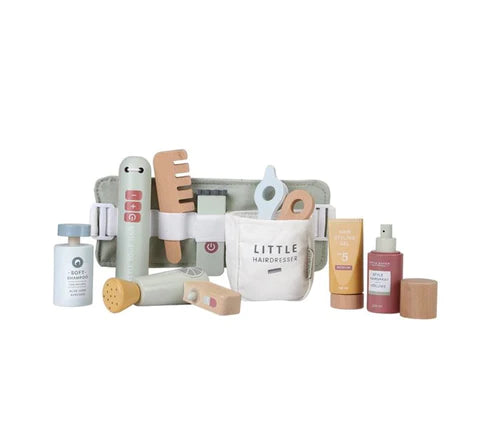 Word een professionele kapper! Nodig je vrienden, familie en poppen uit in je eigen kapsalon. Leef je helemaal in met de verstelbare heupriem en creëer de meest verbluffende kapsels. Deze houten set met benodigdheden voor het kappersvak bevat een speelgoedschaar, föhn, stijltang, tondeuse, kam, shampoo, haarlak en stylinggel. Je kleintje zal heel veel plezier beleven als kapper.
