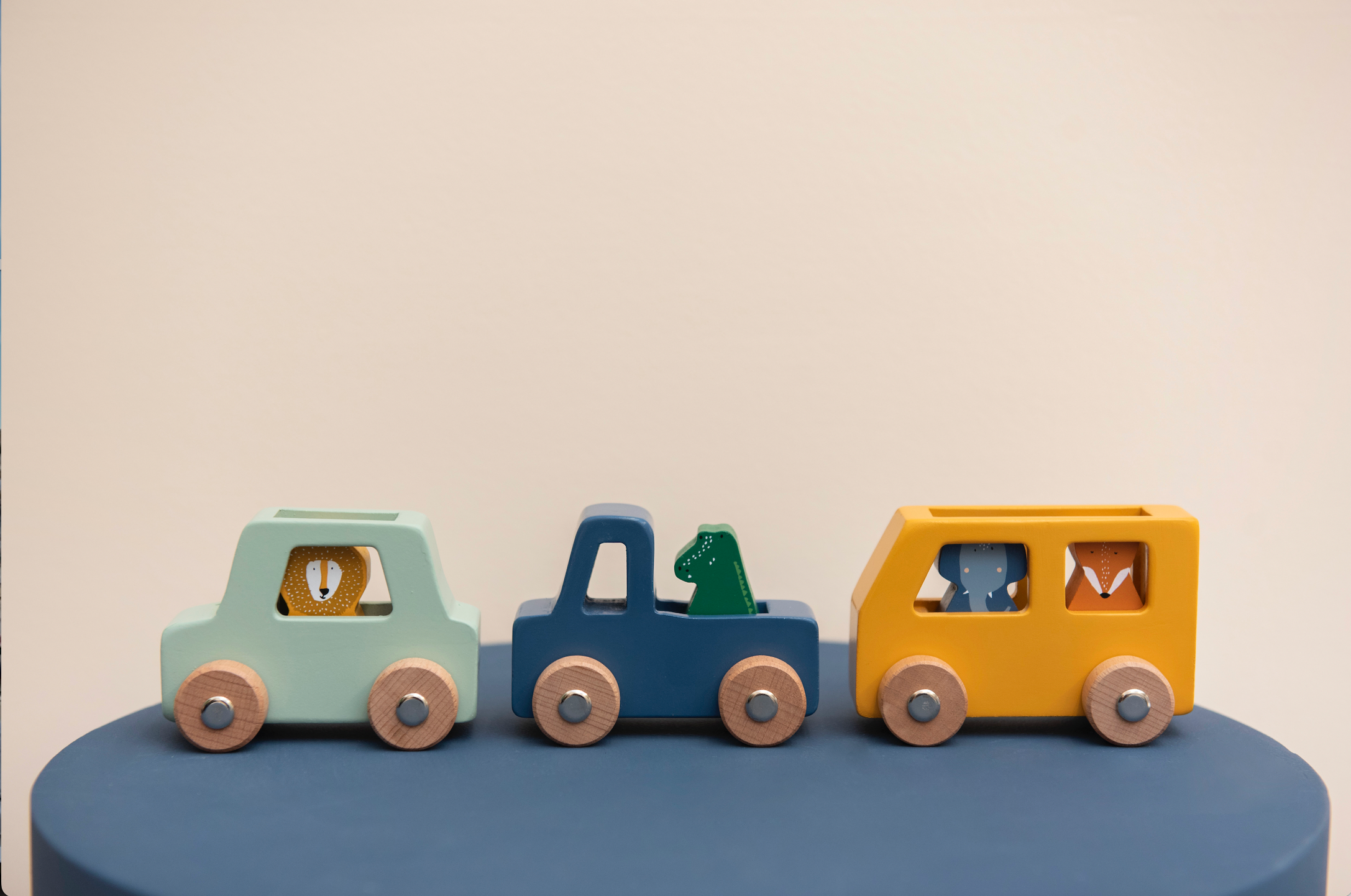 Toet, toet! Hier komen onze dierenvrienden in hun auto's! Mr. Crocodile heeft een coole truck om in te rijden. Mrs. Elephant en Mr. Fox rijden samen in hun grote gele bus. Mr. Lion heeft zijn eigen kleine autootje om in rond te rijden. Elk dier past in elke auto waardoor er heel veel leuke combinaties te maken zijn met deze 4 diertjes en hun 3 auto's. De complete set is gemaakt van 100% FSC © gecertificeerd hout. Alle verven zijn op waterbasis en veilig voor baby's.