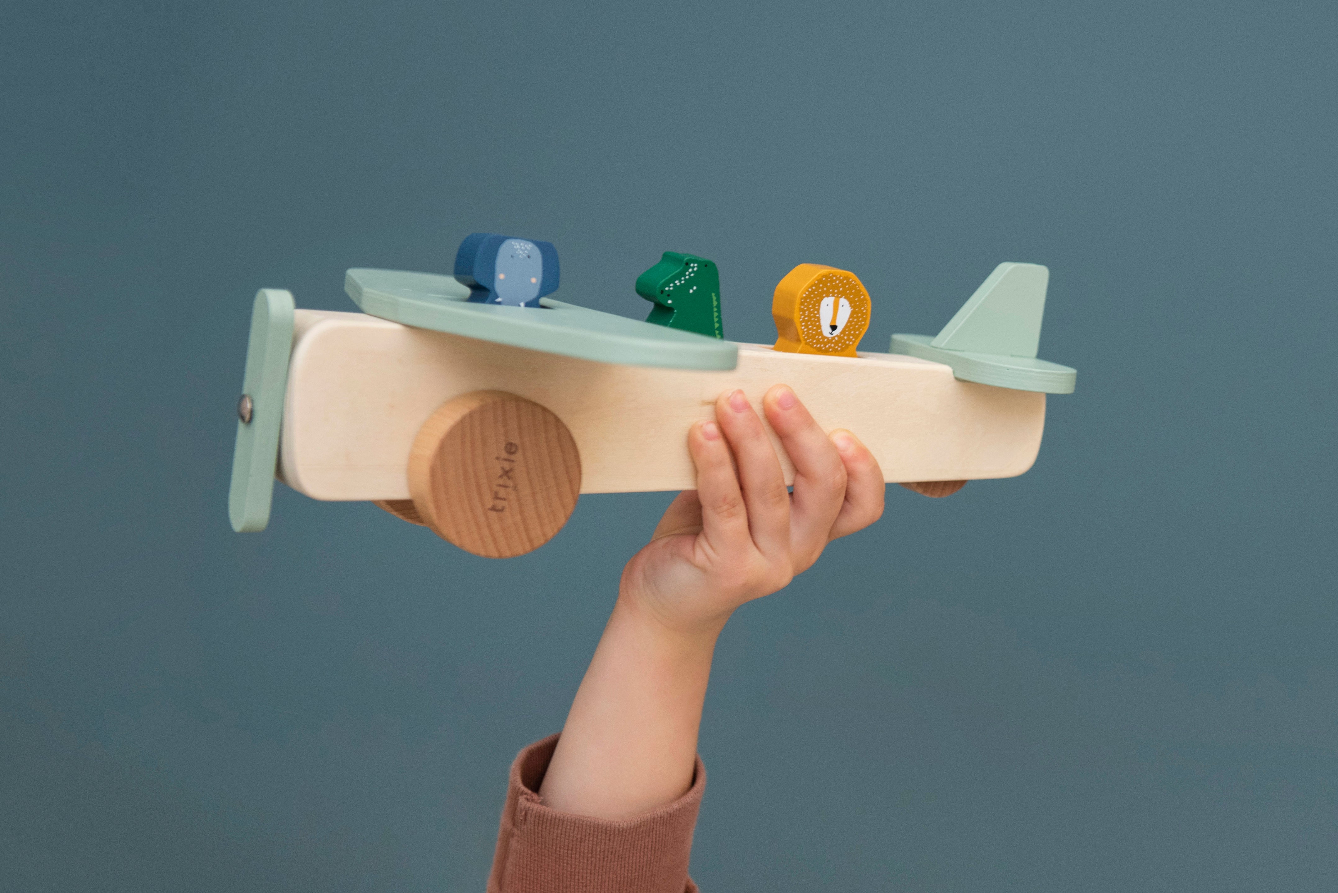 Kom mee vliegen met onze dierenvrienden! Mr. Crocodile is klaar om op te stijgen. Samen met zijn twee passagiers reizen ze de wereld rond. Elke dierenpion past in elke stoel. Een wiel aan de voorkant en een verborgen wiel aan de achterkant zorgen ervoor dat de dieren veilig kunnen landen. Draai aan de propellor en het vliegtuig is klaar om te vertrekken! Het vliegtuig en de dieren zijn gemaakt van 100% FSC © gecertificeerd hout. Alle verven zijn op waterbasis en veilig voor baby's.