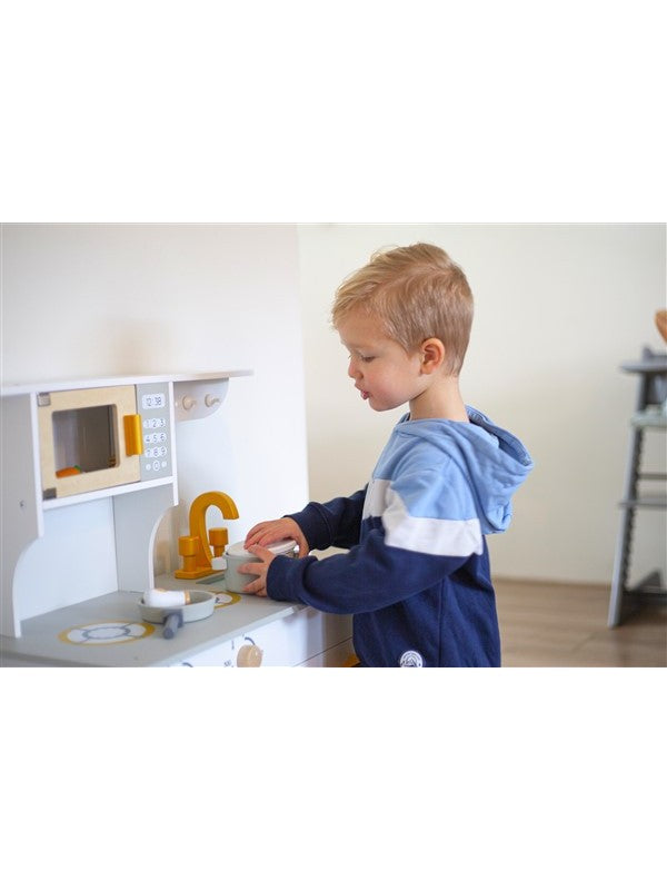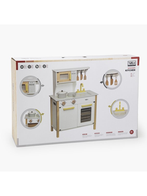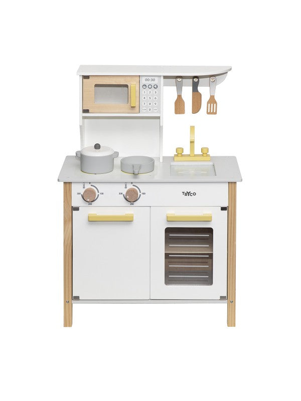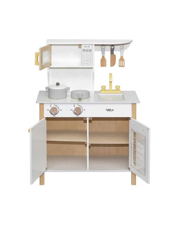 Je kleine wordt een echt keukenprins(es)je met dit leuke houten keukentje van Tryco! Het keukentje is wit van kleur met gouden details, het zal een echte eye-catcher zijn voor in de speel/woon-kamer.