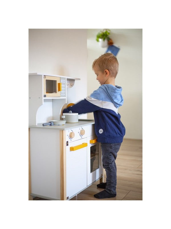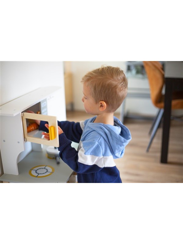 Het keukentje wordt geleverd met twee pannetjes, 2 spatels en een mes. Dus je kindje kan zich helemaal uitleven. Het deurtje kan geopend worden voor extra opbergruimte en aan de knopjes van het fornuis kan gedraaid worden. In de magnetron warmt je kindje gemakkelijk eten op. Het lijkt net echt!