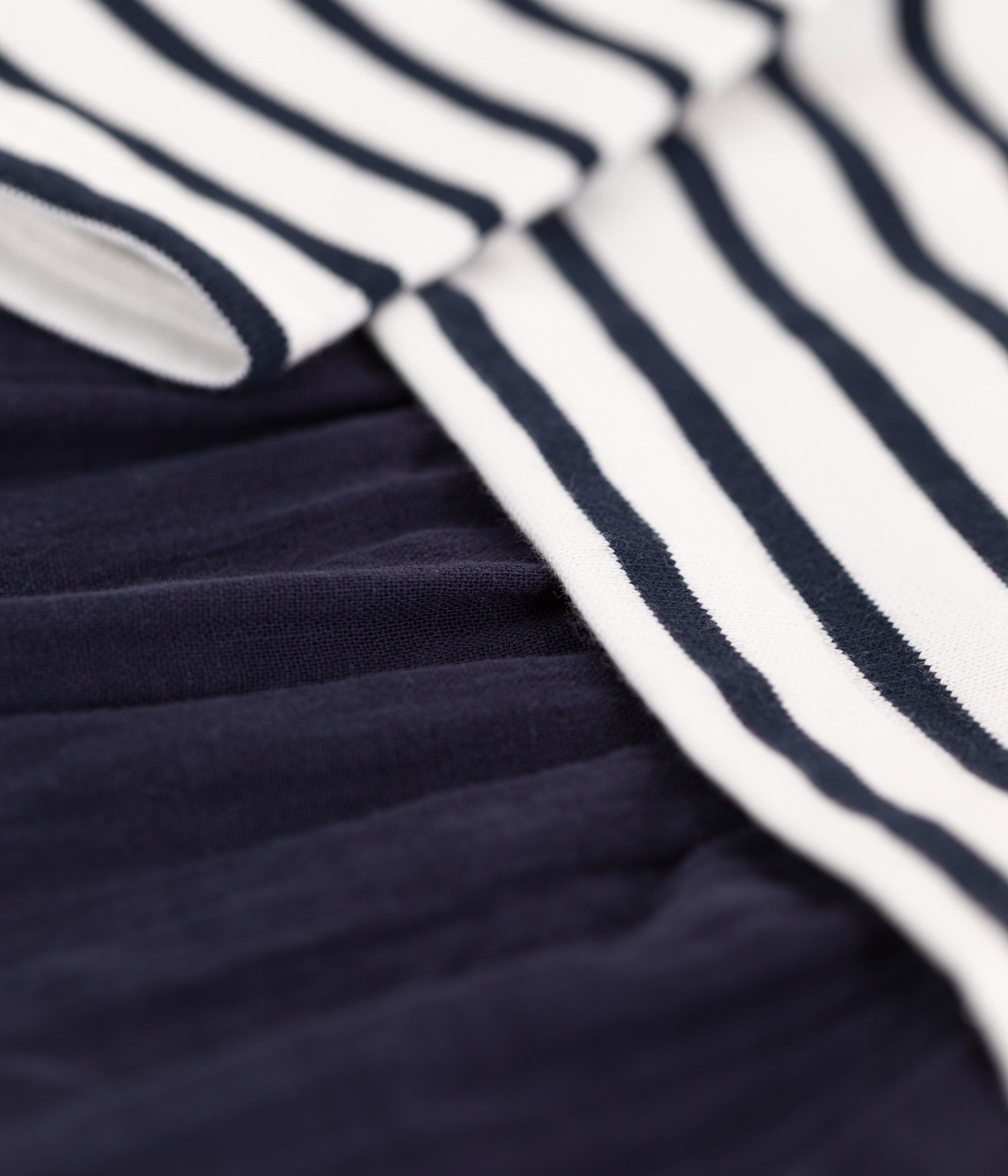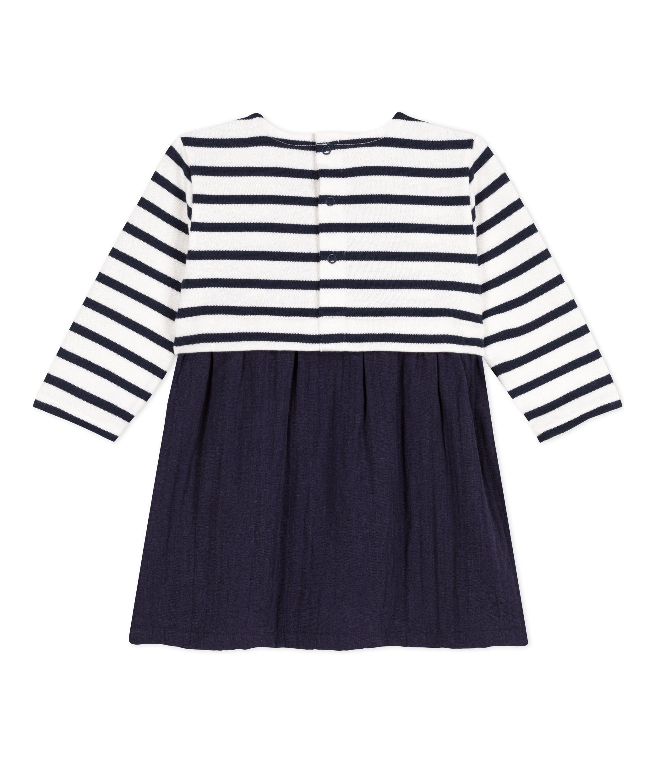 - Bovenkant van de gestreepte marinière-jurk van dikke jersey met lange mouwen.
