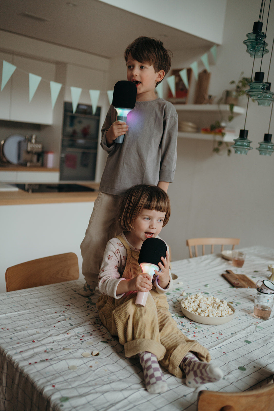 KIDYMIC is de ideale aanvulling voor uw karaokemomenten! Deze alles-in-één microfoon biedt een leuke muzikale ervaring met zijn geluids- en lichteffecten, stemveranderingen en Bluetooth-verbinding. Uw kinderen zullen urenlang plezier hebben en meezingen. Bovendien versterkt het hun zelfvertrouwen om een show te geven. KIDYMIC biedt een uitzonderlijke ervaring voor het hele gezin. Laat je creativiteit de vrije loop en laat de show beginnen!