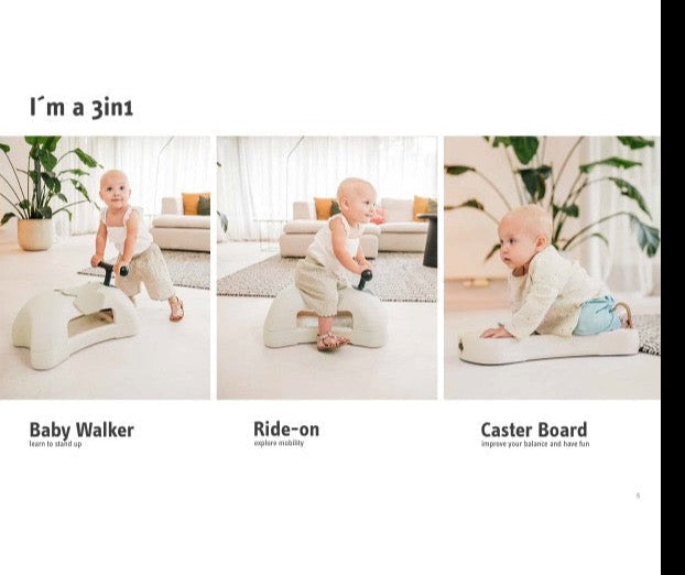Allereerst een duwwagentje, tweede functionaliteit is loopwagentje, derde functionaliteit is de grondsurfer. Laten we de handige opbergruimte binnenin niet vergeten. Transformeert van duw- naar loopwagentje naar grond surfer zonder gereedschap!