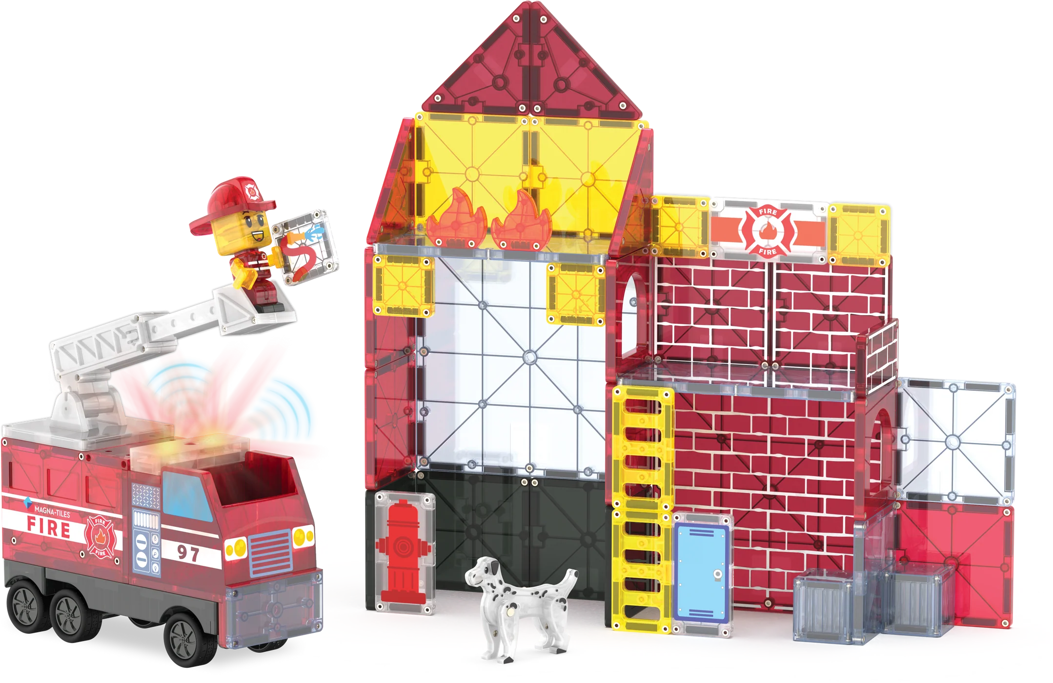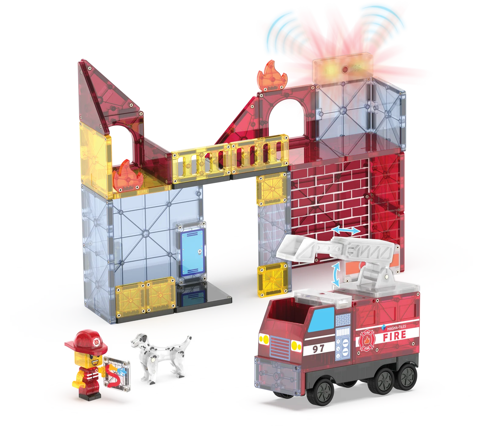 De MAGNA-TILES Fire Station 50-delige set onderscheidt zich door de Licht- & Geluid-tegel, de uitschuifbare brandweerwagenladder en de mix-en-match brandweermanfiguur, die zorgen voor actievolle reddingsmissies boordevol creativiteit en heldendom.