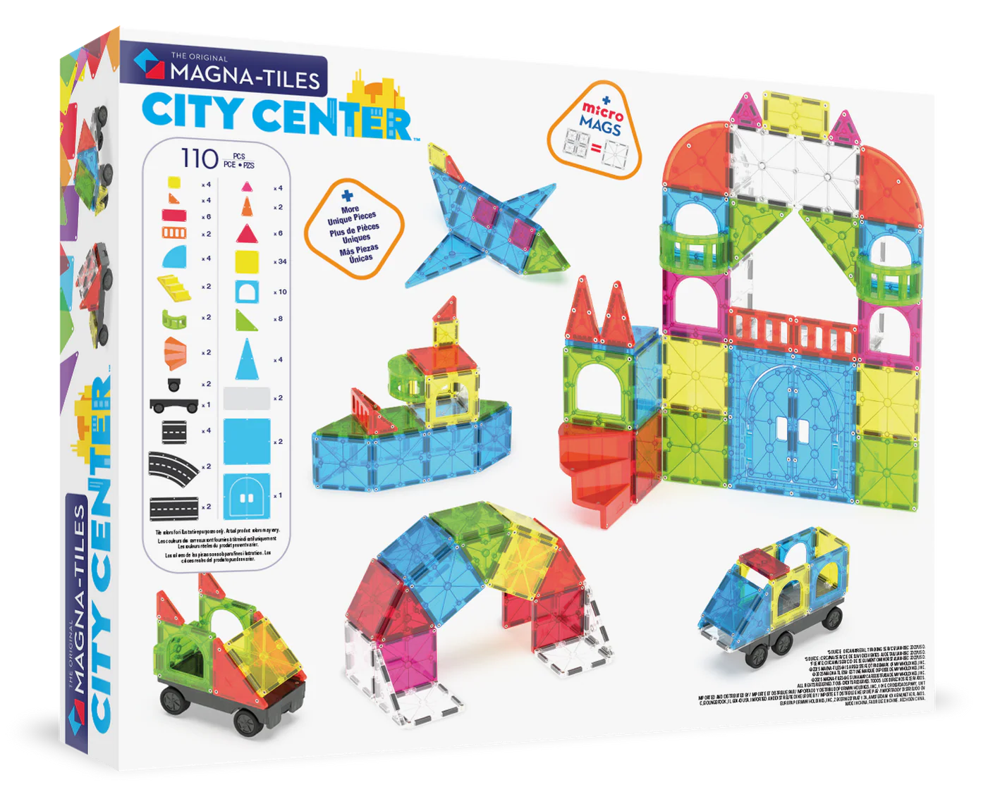 De MAGNA-TILES City Center 110-delige set laat beginnende stadsplanners een levendige, magnetische metropool bouwen met op maat gemaakte voertuigen, wenteltrappen, wegtegels en microMAGS – voor eindeloos fantasierijk spel.