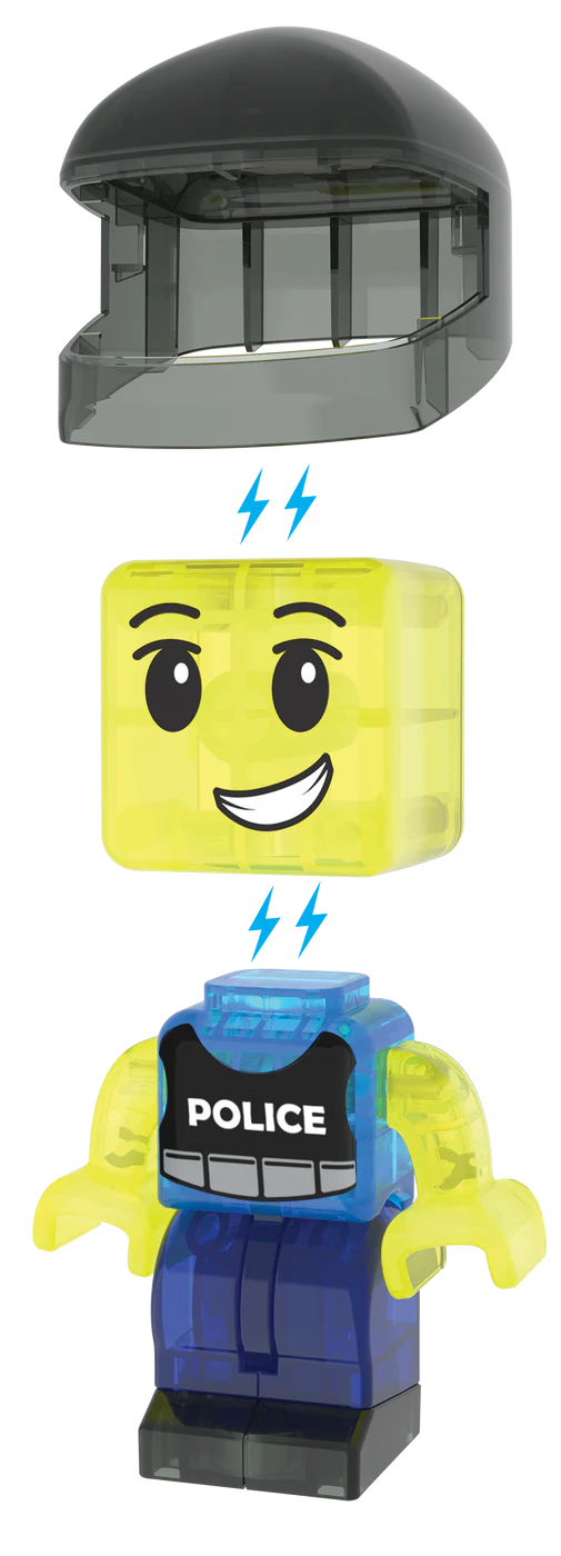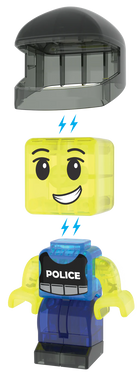 20 magnetische stukken, inclusief 1 Mix & Match politiefiguur (hoofd, lichaam en helm).