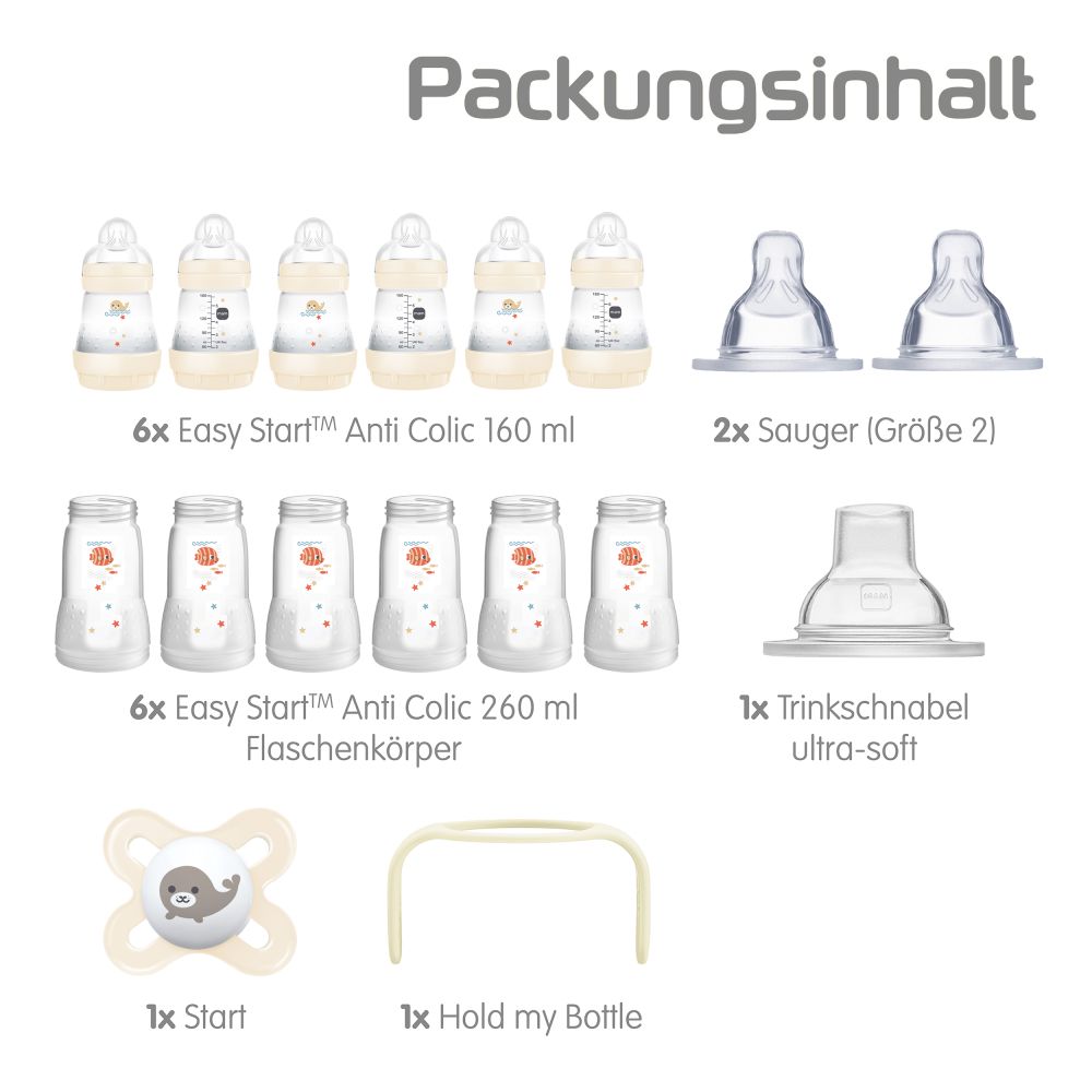 - Inhoud verpakking – MAM Easy Start Anti-Colic Set XXL, 6 x babyflesje met speen size 1 (160ml), 6 x lichaam van Easy Start™-flesjes (260ml), 2 x speen size 2, 1 x speen drinktuit 4m+, 1 x handvat, 1 x fopspeen, vanaf 0 maanden, beige
