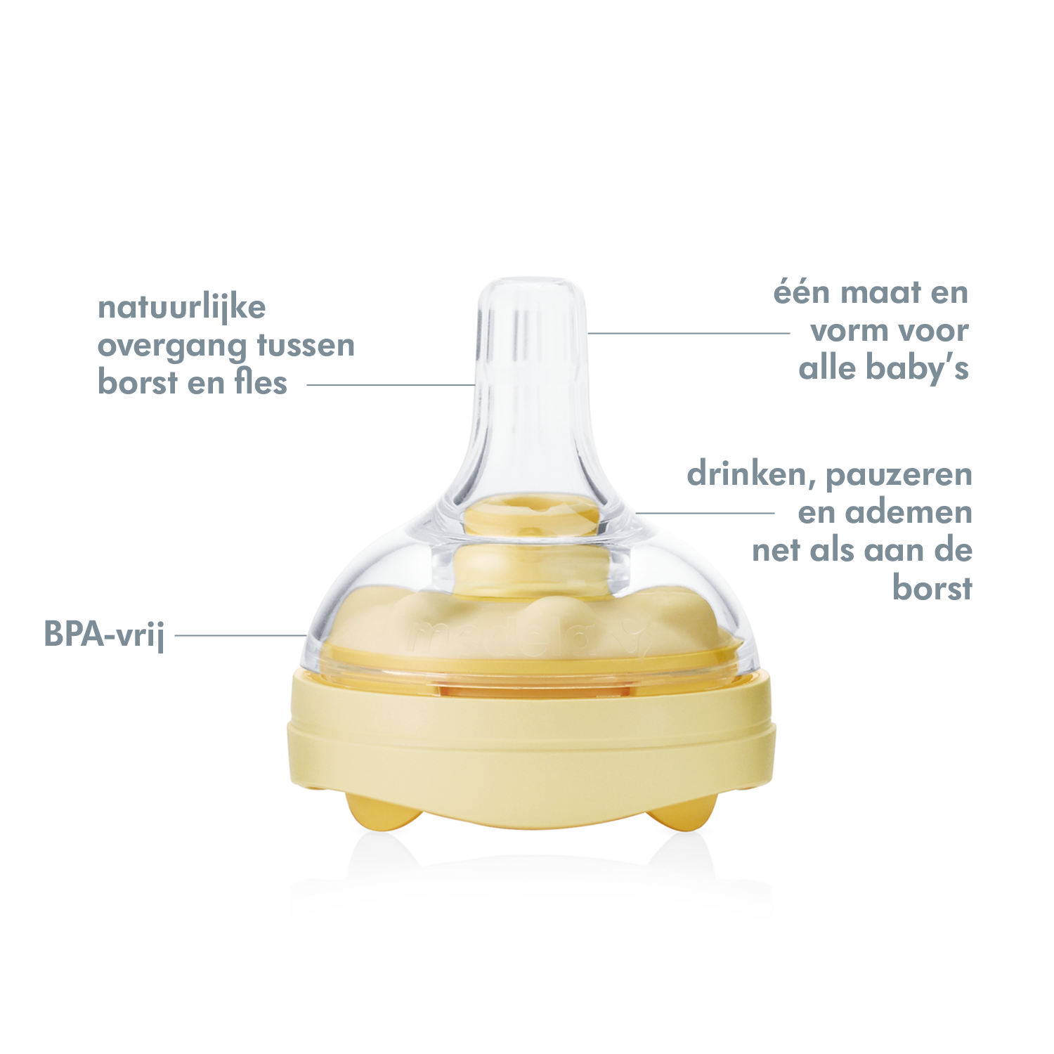 De melkstroom (flow), vorm en lengte van Medela Calma zijn zo ontworpen dat ze blijven aansluiten op de behoeften van je groeiende baby. Dankzij een uniek ventilatiesysteem voorkomen de speen van Calma dat de baby tijdens het voeden lucht hapt.