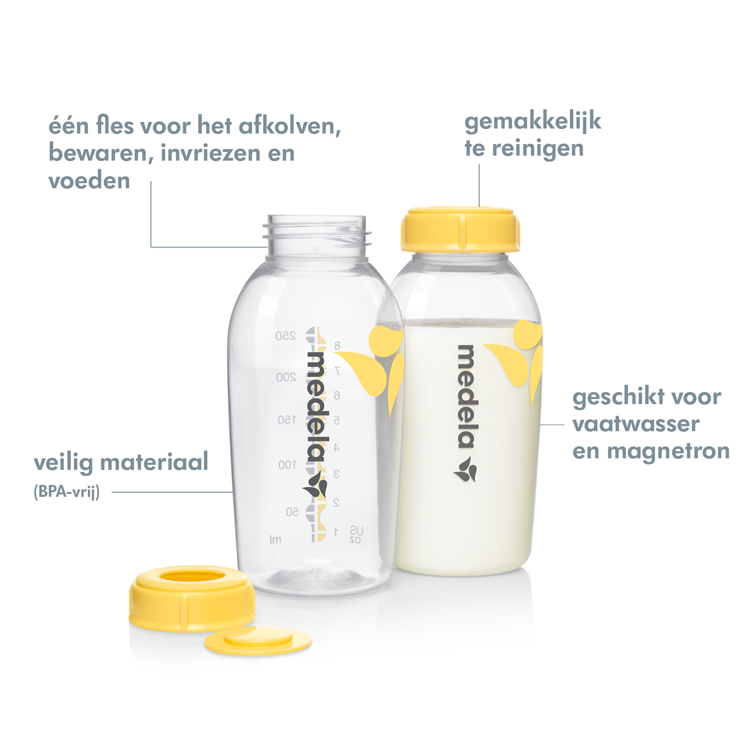 • Weinig overgieten – één fles voor het afkolven, bewaren, invriezen en voeden van moedermelk