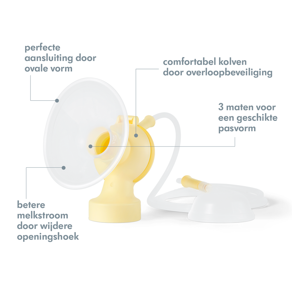 Het borstschild van de nieuwe Medela PersonalFit™ PLUS afkolfset heeft een wijdere openingshoek van 105°, wat voor een betere pasvorm zorgt. Dit helpt om te voorkomen dat de melkkanalen samengedrukt worden en daardoor wordt de melkstroom bevorderd. Daarnaast heeft het schild een ovale vorm dat 360° gedraaid kan worden. Zo kun je het borstschild plaatsen in de positie die het beste aansluit op jouw borst.