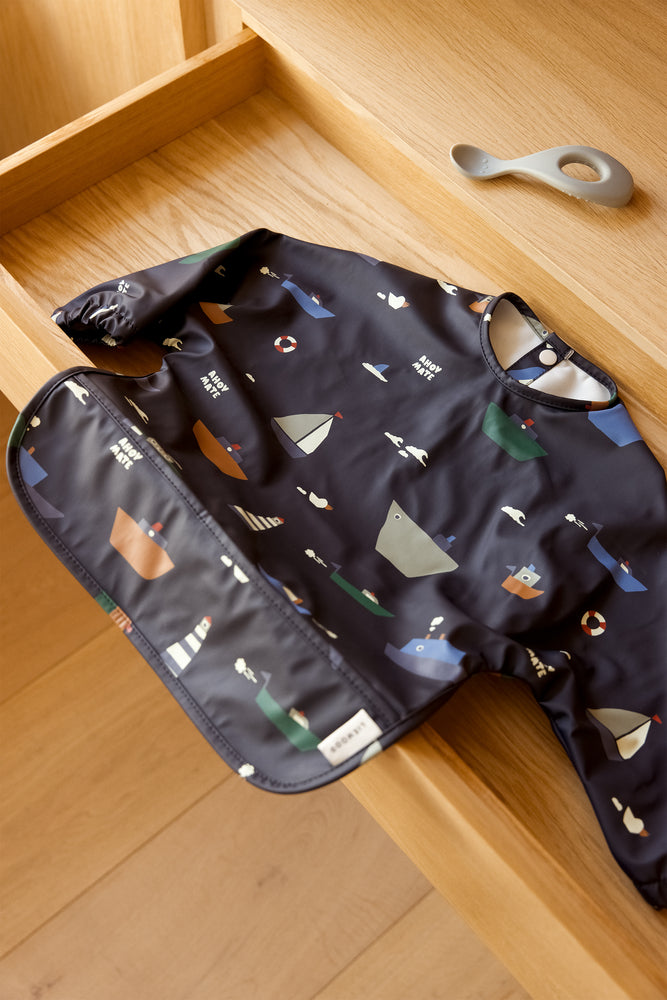 Lichtgewicht cape slabbetje met opvangvakje voor kinderen die leren te eten. Het gerecyclede materiaal maakt het direct herbruikbaar: gewoon afspoelen en schoonvegen.