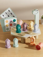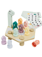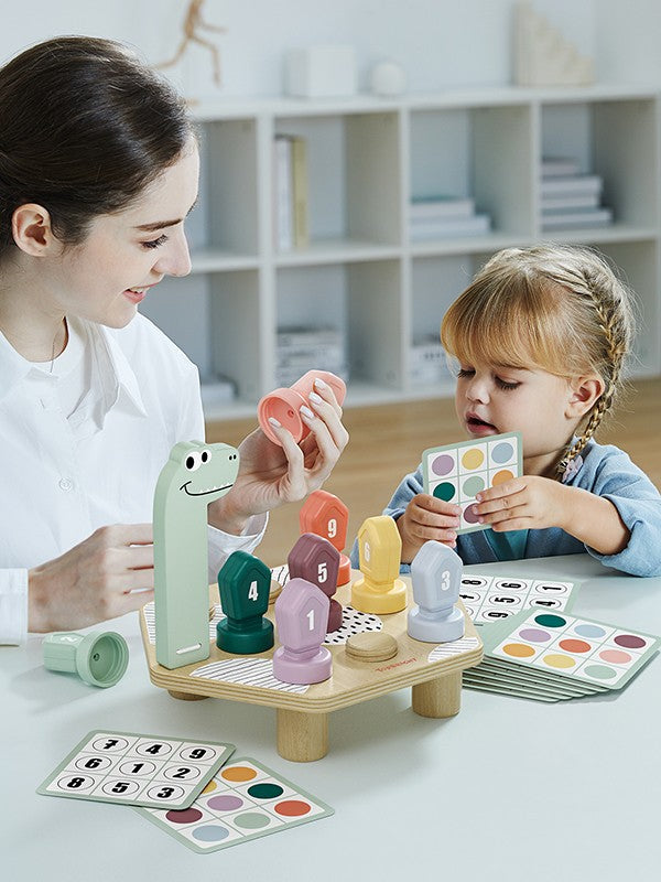 "Welke kleur heeft de 4? - De 4 is groen!" Met het educatieve spel HAPPY DINO TWIST van TOPBRIGHT duiken kinderen vanaf 36 maanden in de wereld van kleuren en cijfers. Kleine ontdekkingsreizigers schroeven kleurrijke deksels op de rug van een vrolijke dinosaurus en leren spelenderwijs over kleuren en cijfers. De kleurrijke schroefdeksels zijn genummerd van 1 tot en met 9. De aan beide kanten bedrukte opdrachtkaarten maken leren dubbel zo leuk! Aan de ene kant ontdekken kinderen spannende kleurpatronen die ze nabootsen met de deksels op de rug van de dinosaurus. Dit traint niet alleen de kleurherkenning, maar stimuleert ook creatief denken. De andere kant van de kaarten gaat verder met cijfers: hier oefenen kleintjes op een speelse manier het tellen door het bijpassende getallenpatroon na te bootsen. Het slimme schroefmechanisme van het spel helpt kinderen hun fijne motoriek te ontwikkelen en stimuleert tegelijkertijd hun cognitieve vaardigheden. Terwijl de kinderen aan de kleurrijke flessendoppen draaien, trainen ze hun hand-oogcoördinatie en hebben ze tegelijkertijd veel plezier.