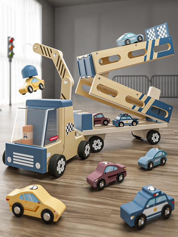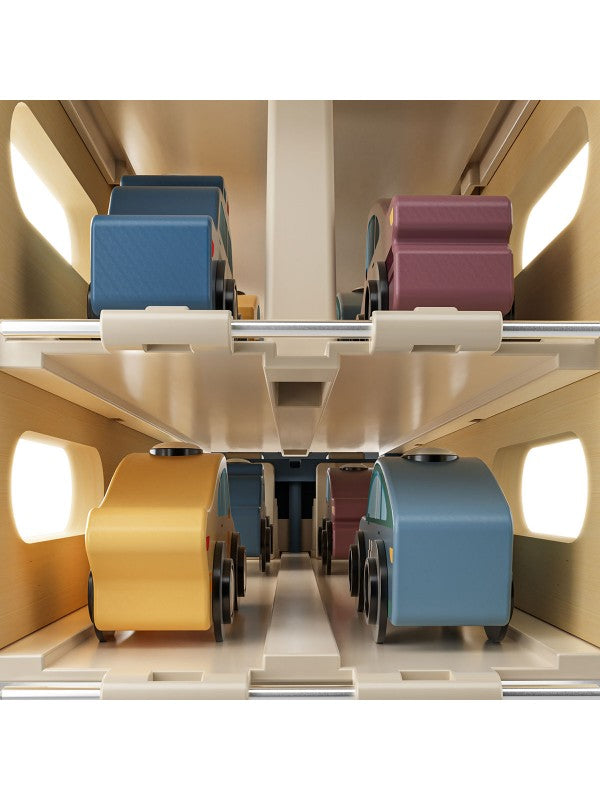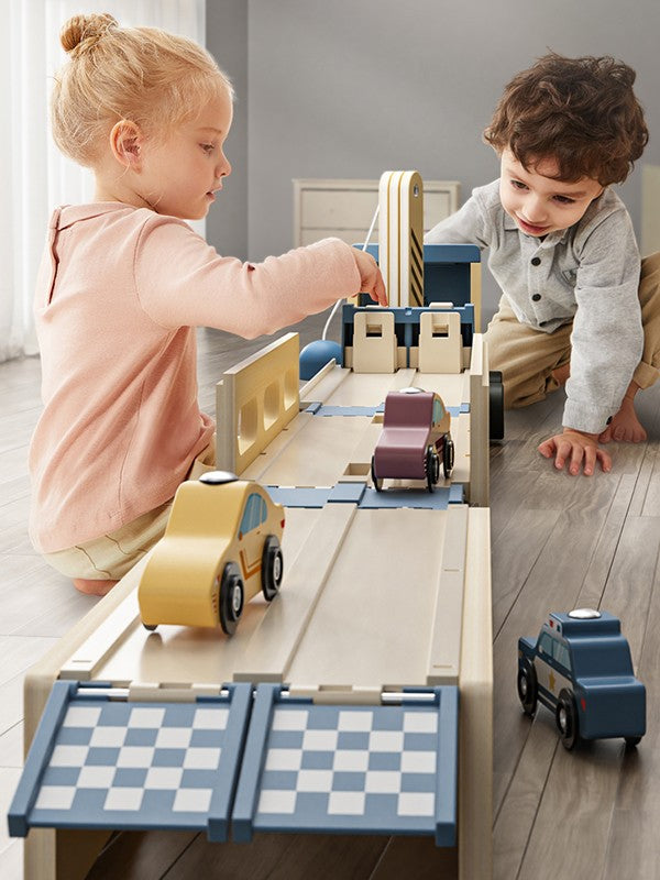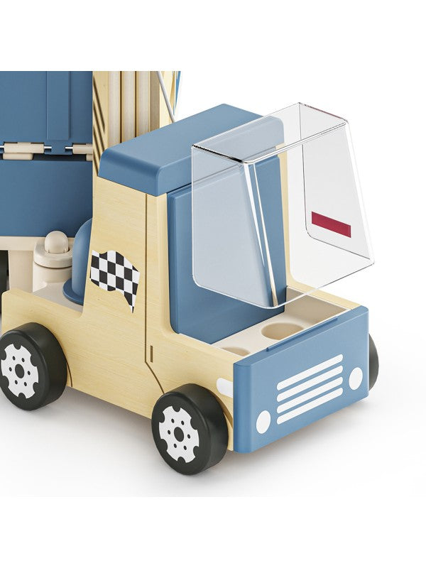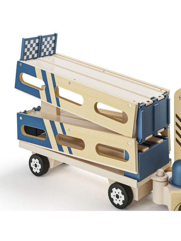 Klaar, af, af! Welke auto is het snelst? De Roll & Race Autotransporter van TOPBRIGHT combineert alles wat kleine autofans vanaf 36 maanden zal bekoren. Het is niet alleen een coole autotransporter, maar ook een spannende racebaan. De verplaatsbare transporter biedt plaats aan acht kleine auto's op twee niveaus. In een paar simpele stappen verandert de houten autotransporter in een 103 centimeter lange racebaan met twee banen, die kinderen uitnodigt om deel te nemen aan snelle autoraces. Of ze nu alleen zijn of samen met familie en vrienden - kinderen plaatsen de auto's op de startbaan, drukken op de startknop en de auto's racen over de baan. De autotransporter stimuleert de fantasie van kinderen en nodigt uit tot vrij spel: acht auto's, twee racebanen, een coureur en een magnetische kraan - en de autorace-ervaring is compleet. Kinderen worden creatief en verzinnen spannende verhalen over de 2-in-1 autotransporter. Na het spel kunnen de kleine auto's op de twee niveaus worden opgeborgen. Zo blijft de kinderkamer opgeruimd en kan de volgende speelsessie snel beginnen.