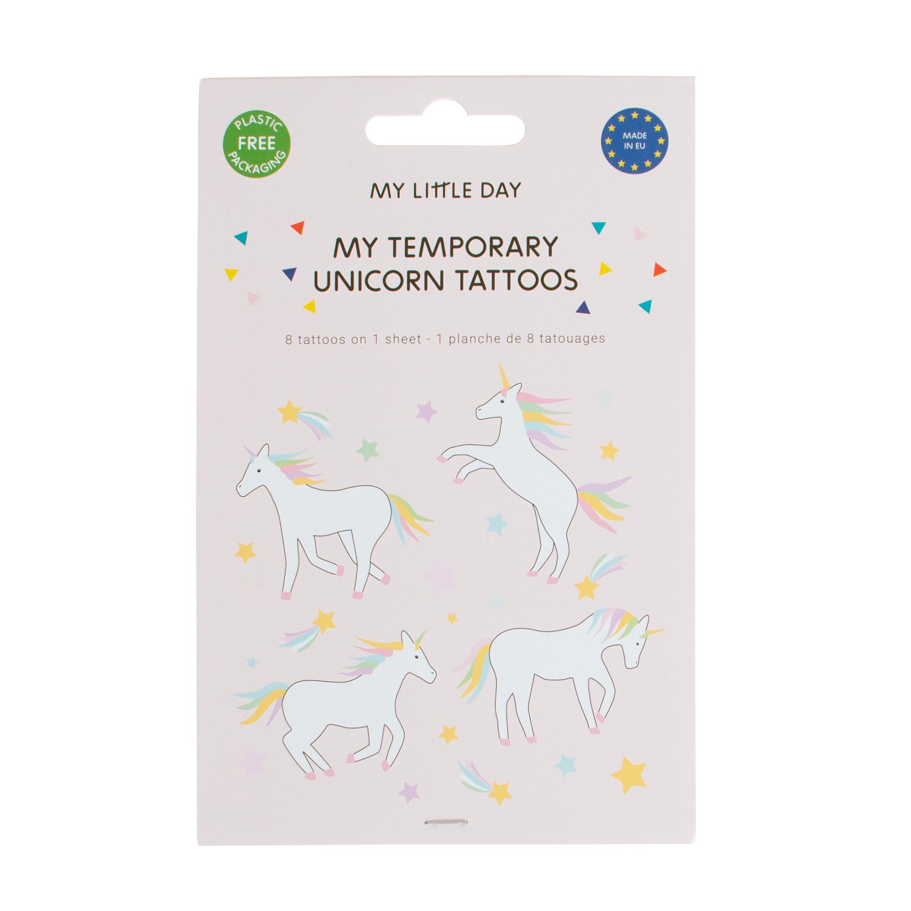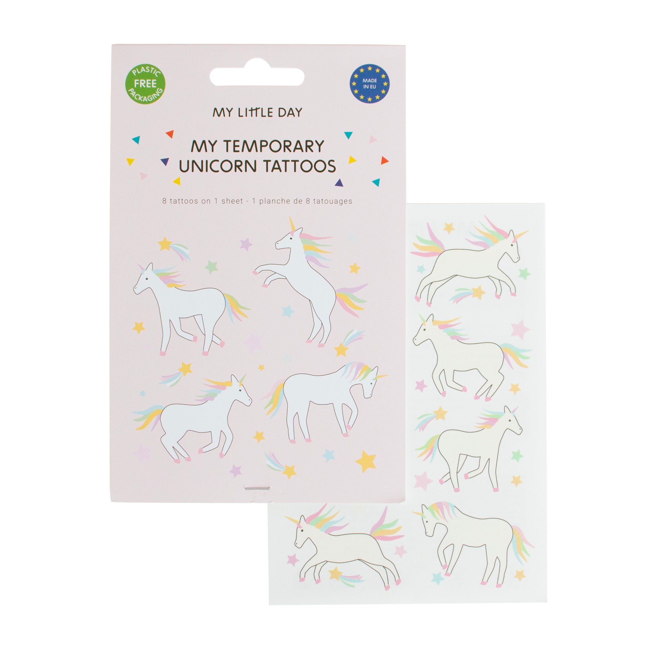 Doe mee met My Little Day voor een prachtig avontuur in de wereld van eenhoorns! 1 pakket van eenhoorntattoo's ontworpen door My Little Day in Parijs. Op elk vel vind je 8 eenhoorns om uit te knippen, wat perfect is voor een eenhoornthema-feest. Je kunt ze in eenhoorn goodie bags doen en je onderdompelen in de wereld van eenhoorns. Deze tatoeages zijn vervaardigd in Europa.