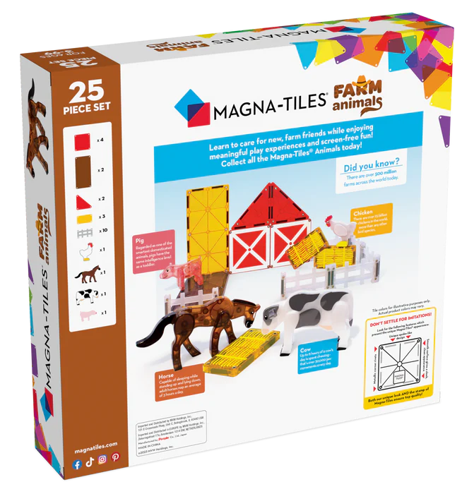 De haan kraait! Het is tijd om met ons mee te gaan naar de boerderij en fantasierijk spelen tot leven te brengen met de nieuwe Boerderijdieren 25-delige set, onderdeel van de MAGNA-TILES® Dierencollectie. Kleine handjes zullen genieten van het verzorgen van dieren door middel van hands-on, scherm-vrije speeltijd. Ouders kunnen beter hun mouwen opstropen, want kinderen zullen willen spelen “weide” bedtijd met de vier, unieke boerenvriendjes, realistische schuur en hooi tegels, en de allereerste magnetische omheining stukken.