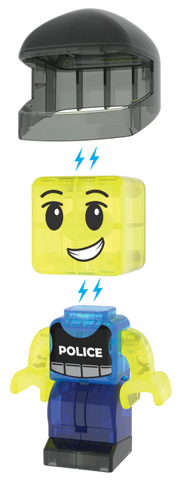 20 magnetische stukken, inclusief 1 Mix & Match politiefiguur (hoofd, lichaam en helm).