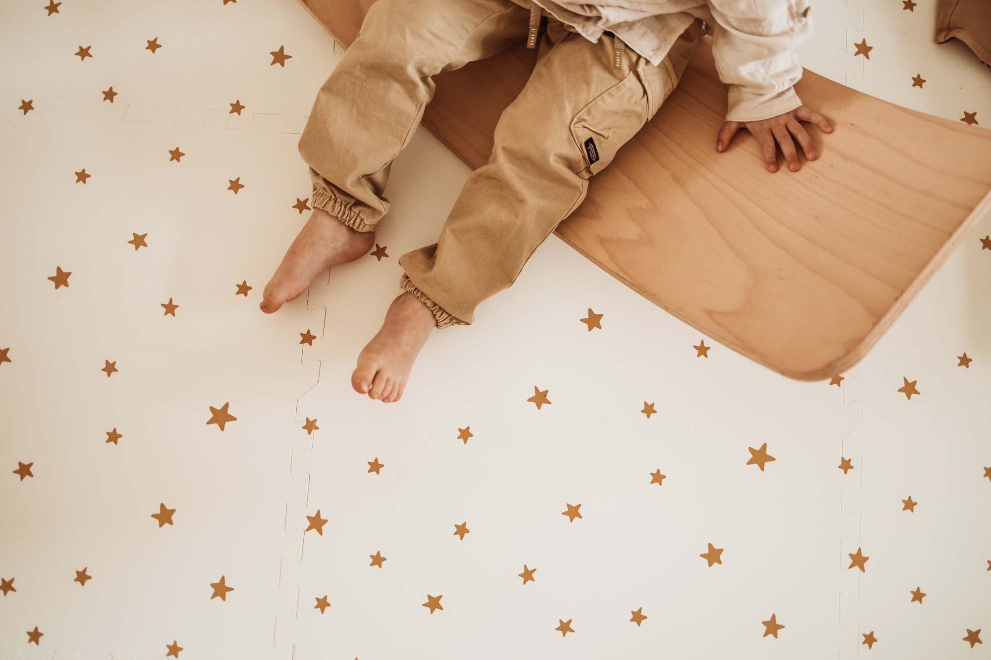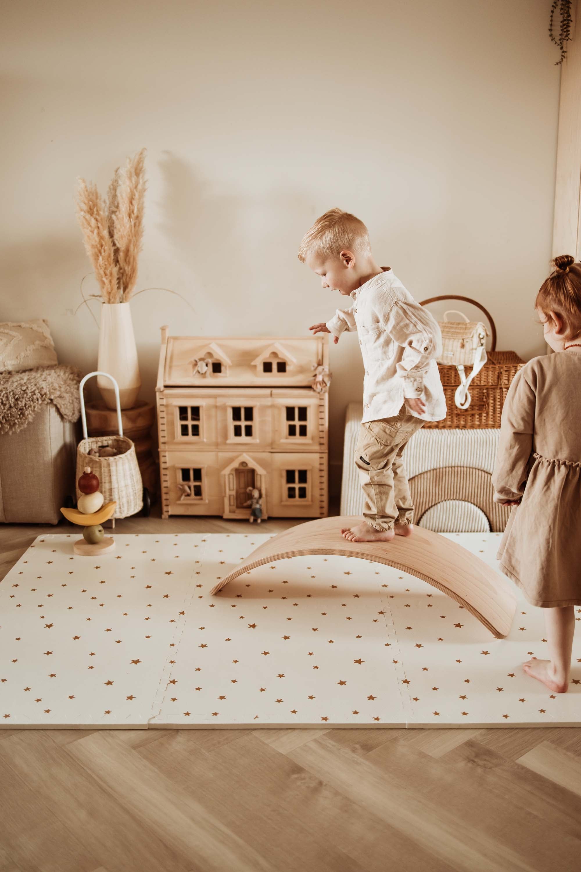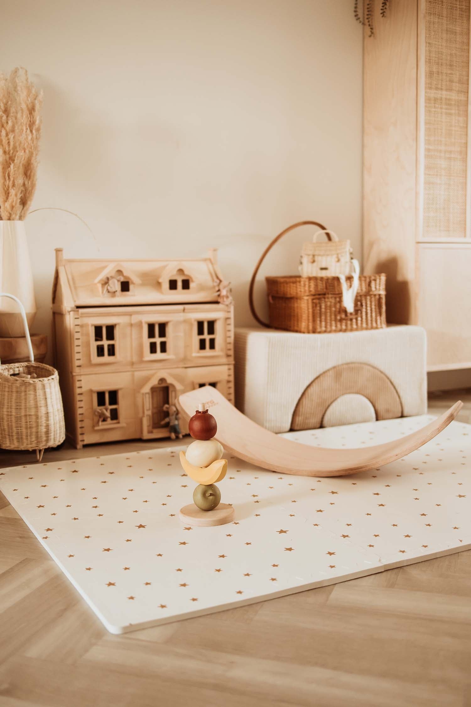 Ga op een buitengewone reis van verbeelding en avontuur met onze Boomhut EEVAA foam kinder puzzel speelmat! Ontworpen om creativiteit aan te wakkeren en eindeloos plezier te creëren, is deze betoverende mat een toegangspoort tot een wereld van verwondering. Aan de ene kant duik je in een magisch rijk waar boomhutten boven weelderige bossen uitstijgen. Speel mee met speelse elfjes en ondeugende kobolden terwijl ze dartelen tussen kleurrijke ballonnen en lieve dieren. Elke hoek van deze betoverende met vol scènes barst van verwondering en opwinding en nodigt kleintjes uit om zich onder te dompelen in hun eigen fantasievolle avonturen. Maar de betovering houdt daar niet op. Keer de mat om en laat je hypnotiseren door een levendig sterrenpatroon in een opvallende mosterdkleur. Dit kosmische ontwerp voegt een vleugje hemelse charme toe aan elke speelkamer of kinderkamer en creëert een dromerige achtergrond voor fantasierijk spel en gezellige verhaaltijd bijeenkomsten. Met onze Boomhut EEVAA foam speelmat is de magie binnen handbereik van je kind. Zie hoe ze verkennen, creëren en hun verbeelding de vrije loop laten op dit veelzijdige en boeiende speeloppervlak. Laat de avonturen zich ontvouwen en zie hoe hun creativiteit opbloeit bij elke speelsessie!