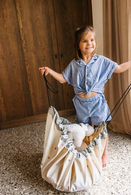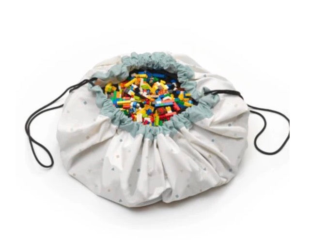 Na het spelen trek je eenvoudig aan de trekkoorden om het speelgoed te verzamelen en transformeer je de mat in een compacte opbergzak – leren en opruimen in één slim ontwerp.
