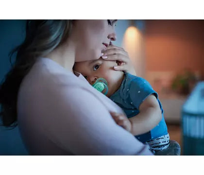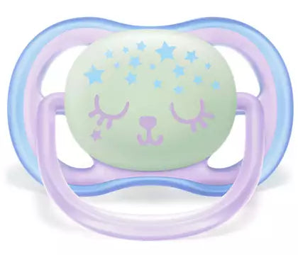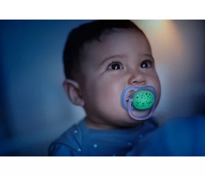 Kalmeer je baby met een fopspeen die de huid laat ademen en die 's nachts gemakkelijk te vinden is. De extra grote luchtgaatjes zorgen ervoor dat de gevoelige huid zacht en droog blijft. Het schildje dat oplicht in het donker vind je gemakkelijk terug als de lampen uit zijn.