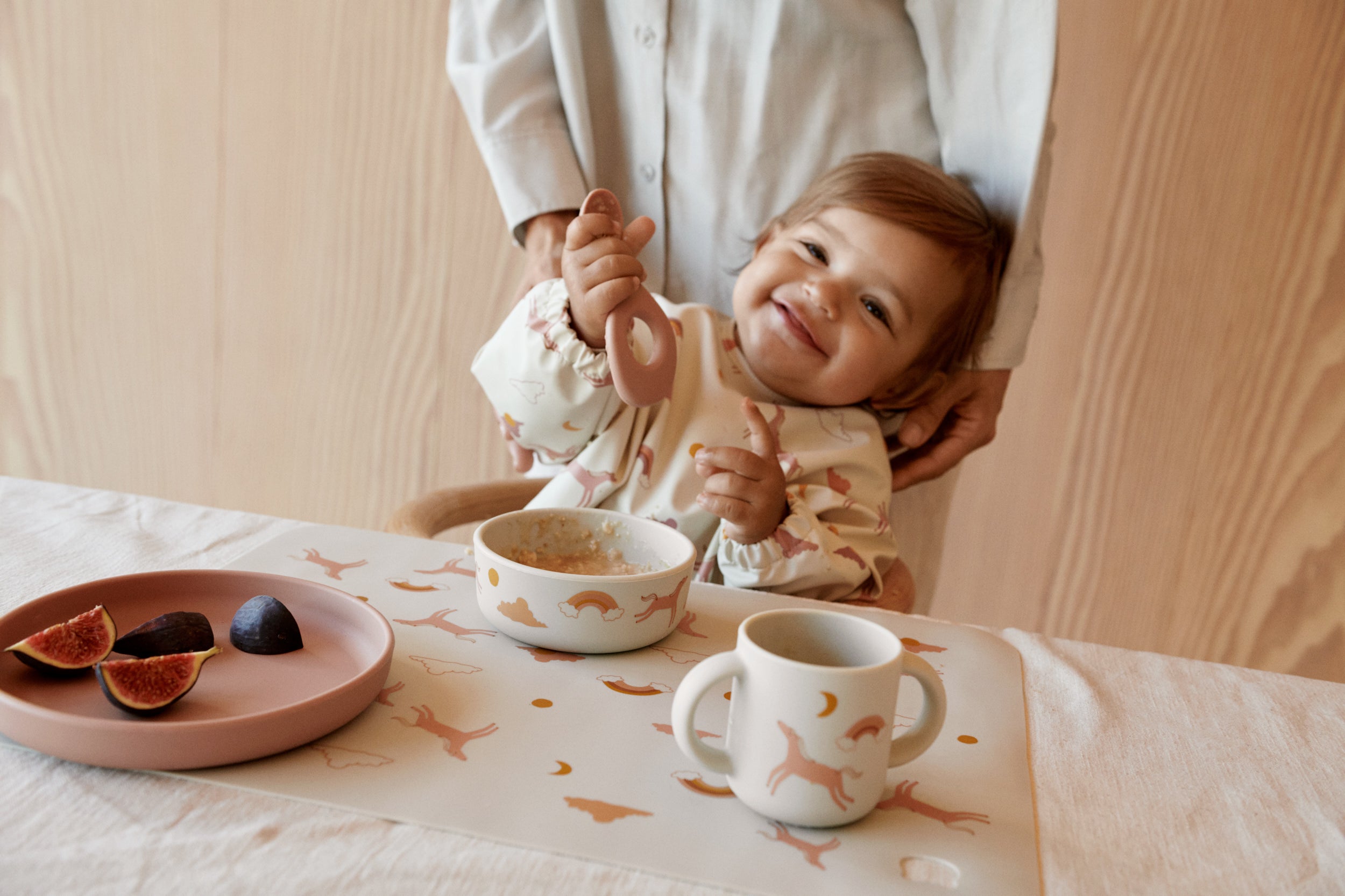 Lichtgewicht cape slabbetje met opvangvakje voor kinderen die leren te eten. Het gerecyclede materiaal maakt het direct herbruikbaar: gewoon afspoelen en schoonvegen.