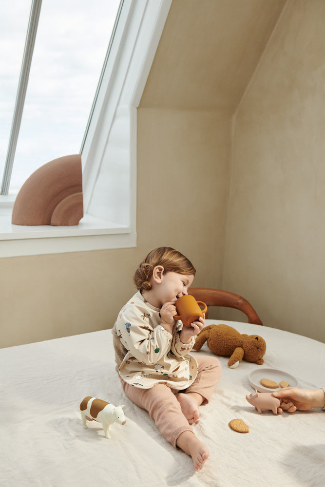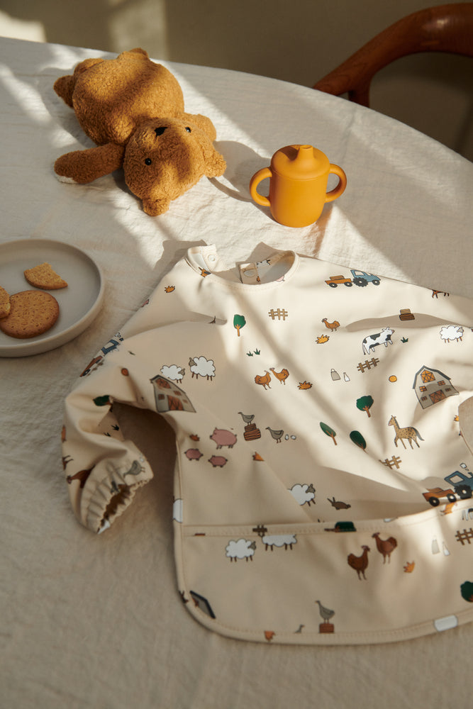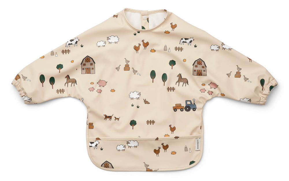 Lichtgewicht cape slabbetje met opvangvakje voor kinderen die leren te eten. Het gerecyclede materiaal maakt het direct herbruikbaar: gewoon afspoelen en schoonvegen.