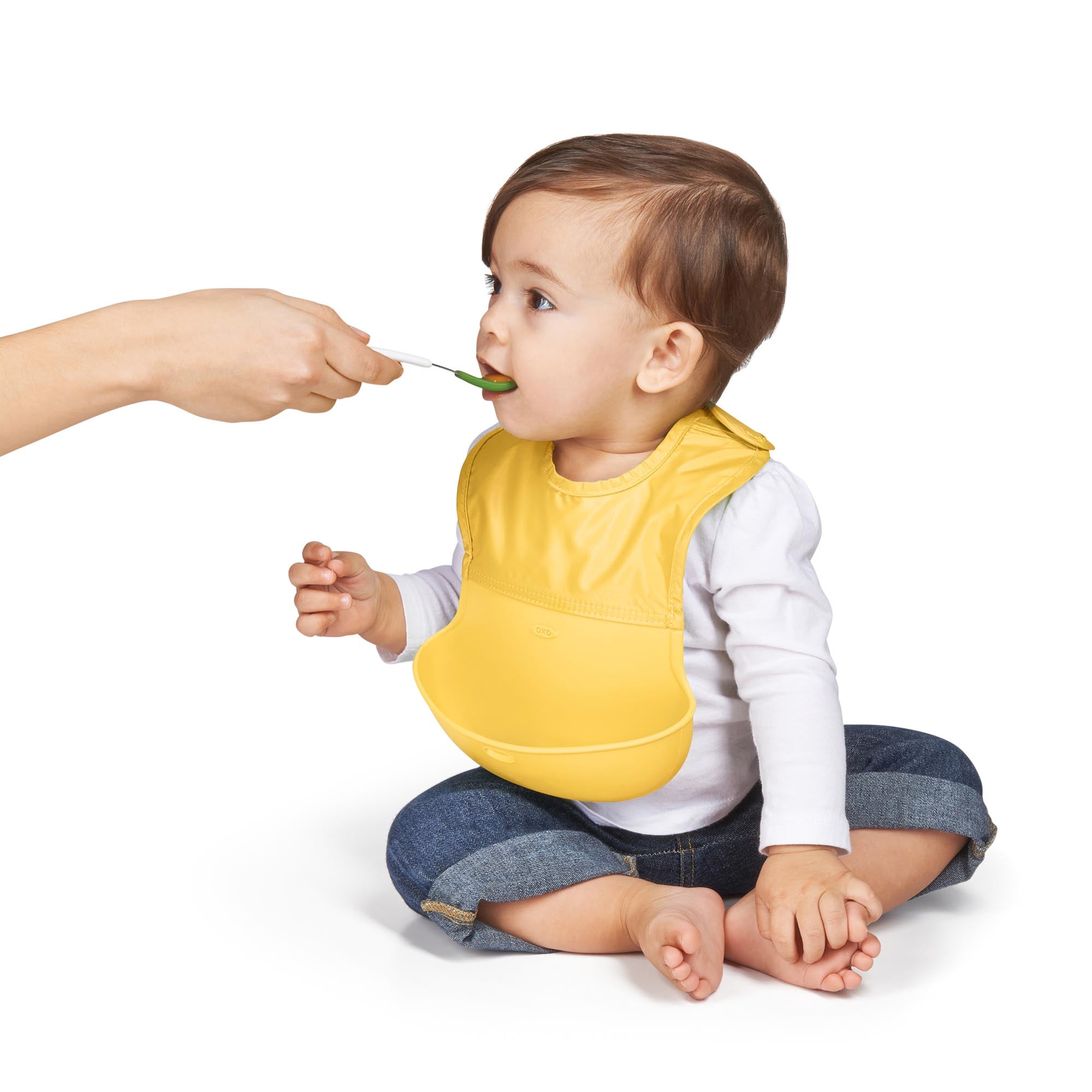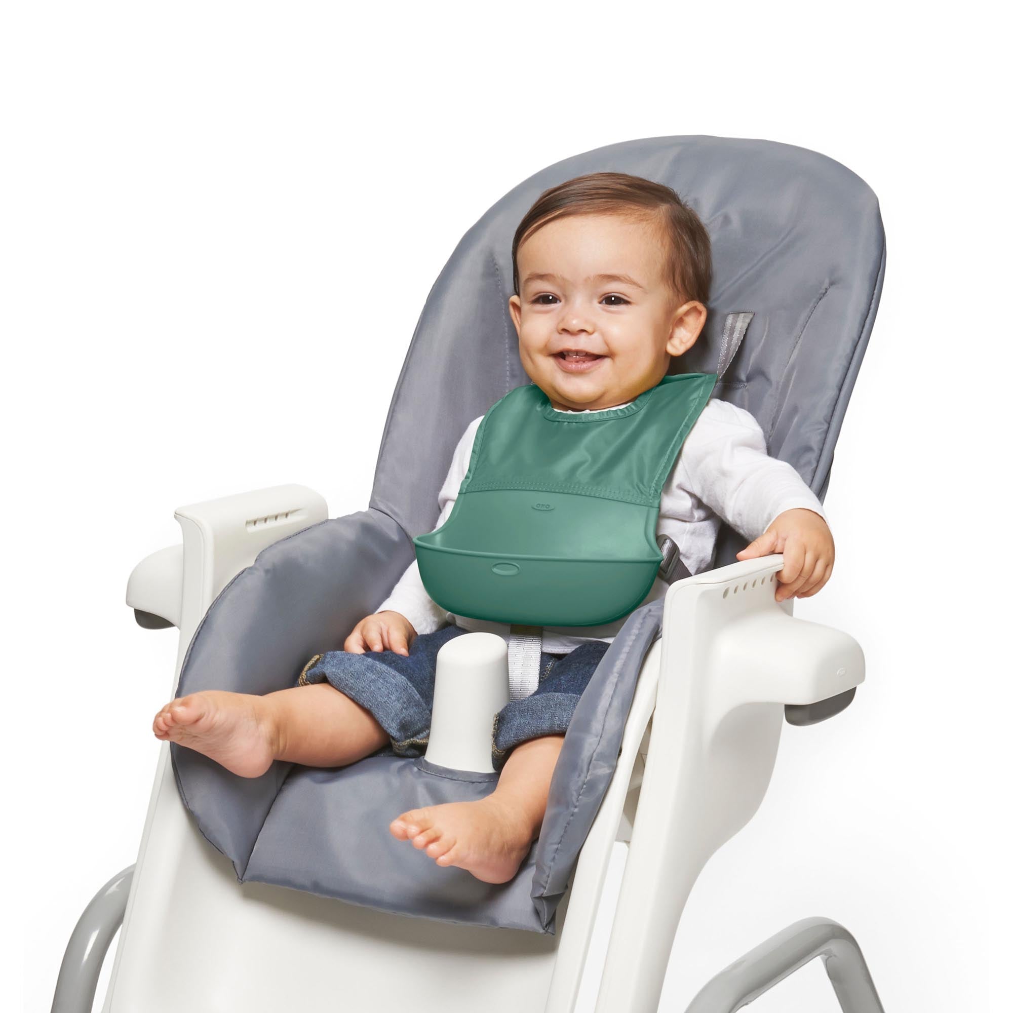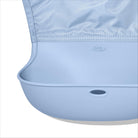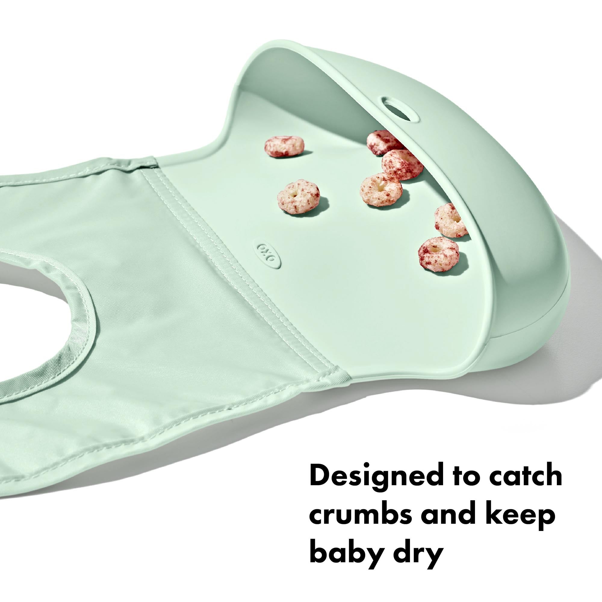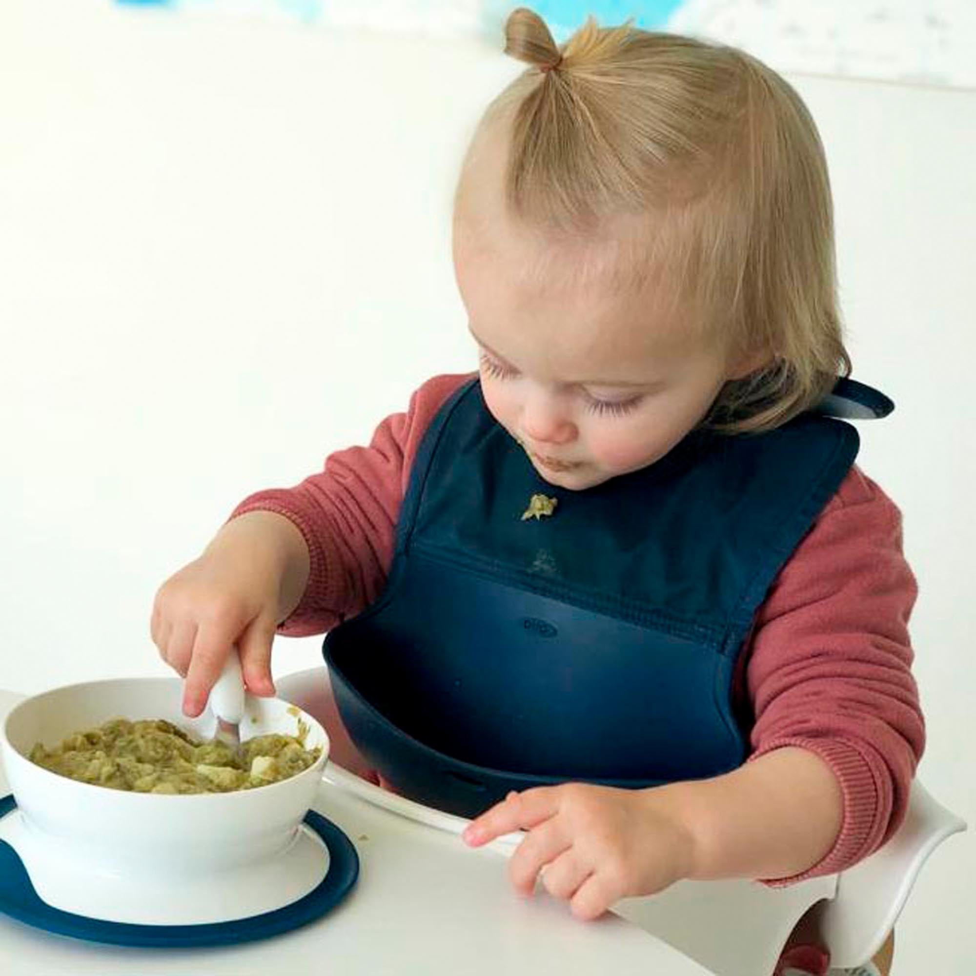 De brede slab beschermt je baby’s kleertjes en de zachte siliconen opvangflap vangt alles op wat het mondje mist.