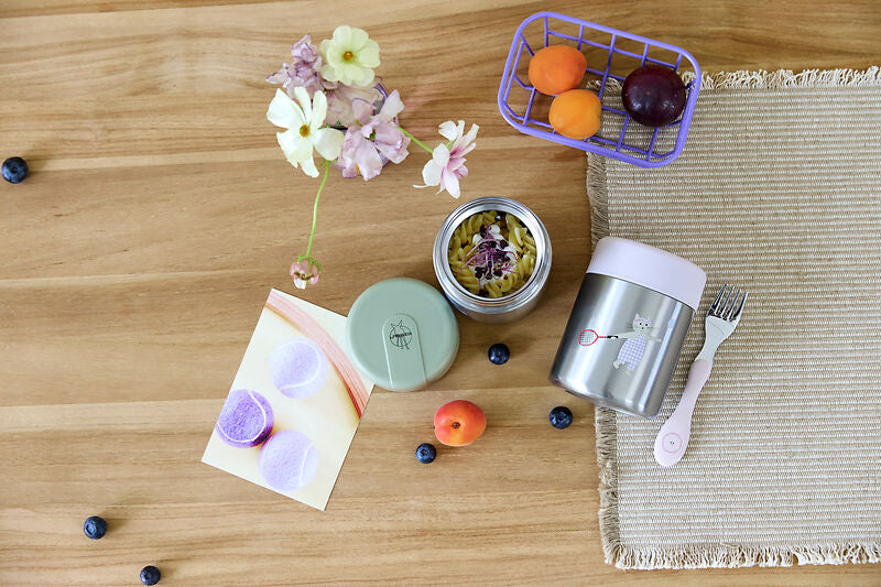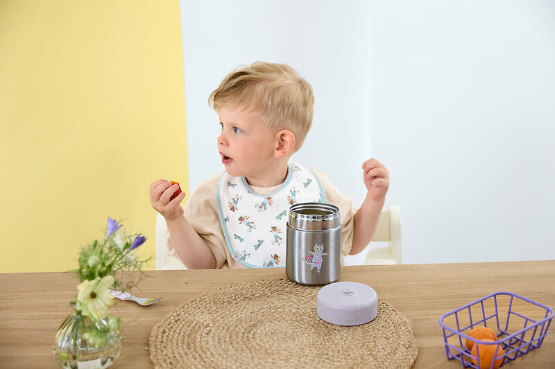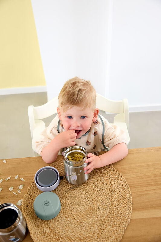 Met de dubbelwandige roestvrijstalen thermocontainer is de pap of lunch voor de kleintjes direct klaar om geserveerd te worden, ook onderweg. De roestvrijstalen container houdt voedsel warm of koud en is geur- en smaakloos. De verwijderbare siliconen ring die in het deksel is geïntegreerd, zorgt ervoor dat er niets kan lekken.