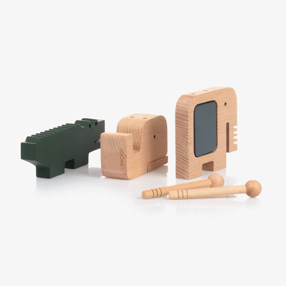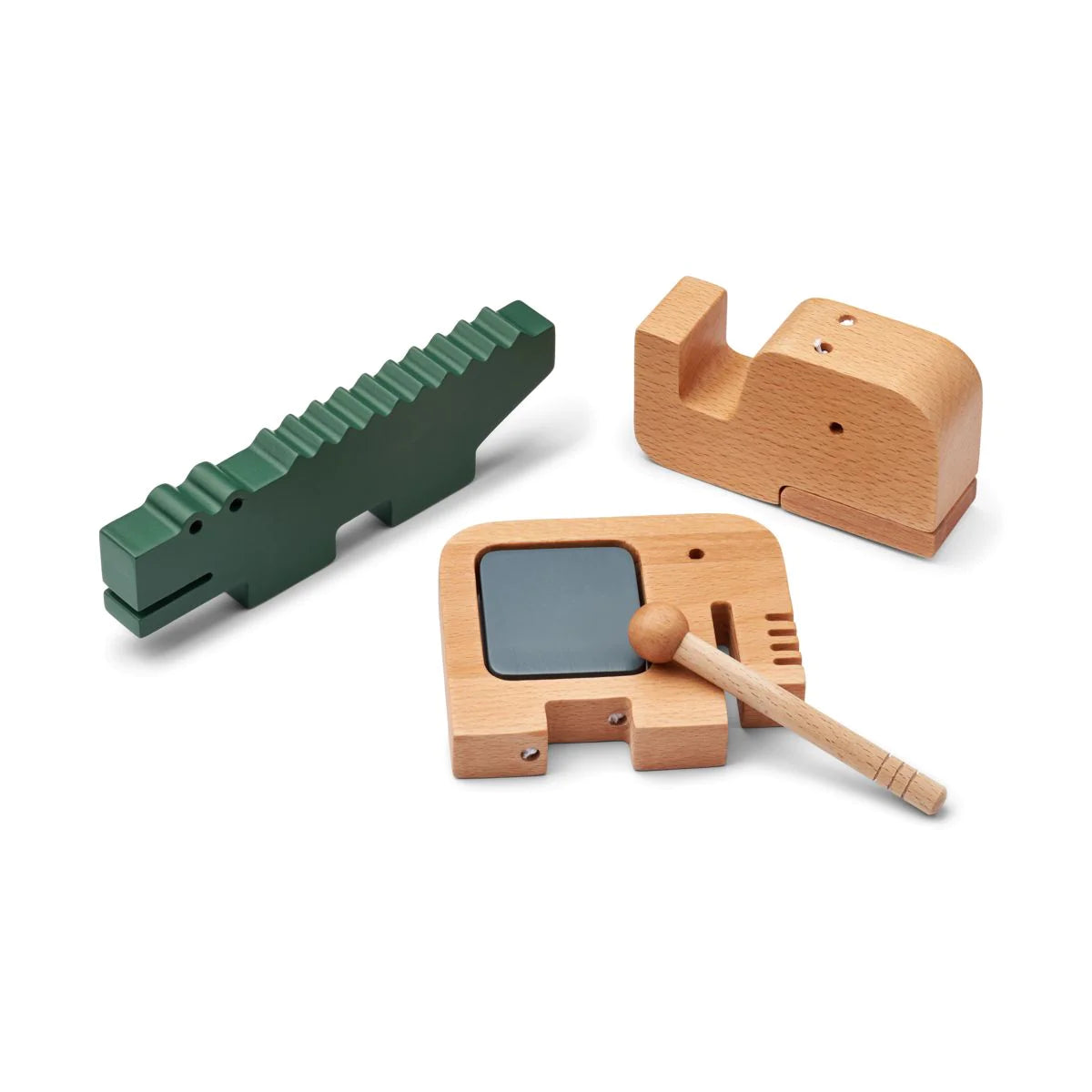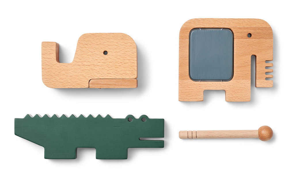 De muziekset bestaat uit een guiro in de vorm van een krokodil, een castagnet in de vorm van een walvis en een trommel in de vorm van een olifant met een bijpassend slagstokje. Naast het gegarandeerde speelplezier zijn deze muziekinstrumenten uitermate geschikt om het gehoor van kinderen te stimuleren.