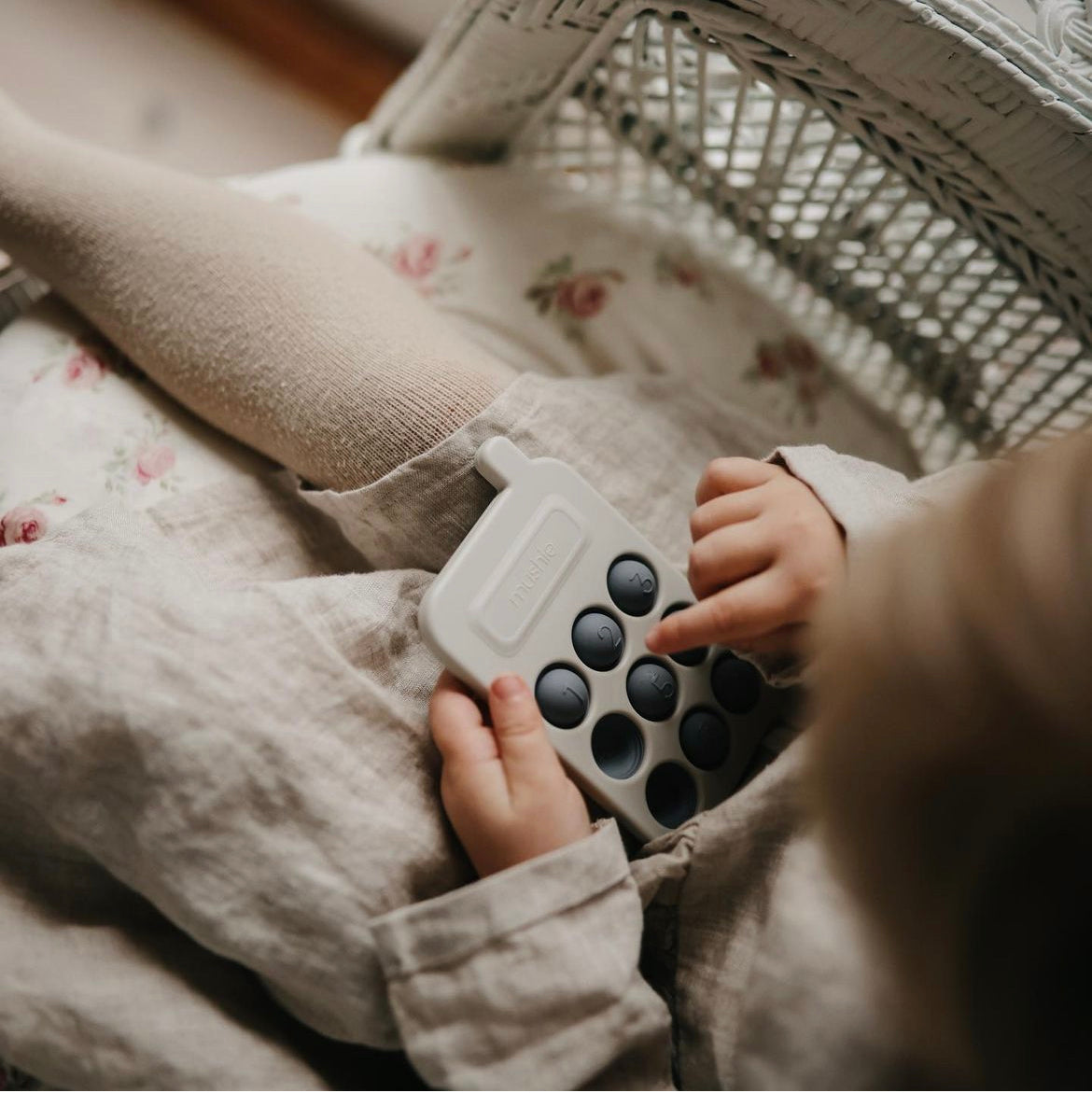 het GSM-drukspeeltje / pop-it van Mushie is gemaakt van 100% niet-giftige, voedselveilige siliconen, waardoor je baby er veilig mee kan spelen en genieten.