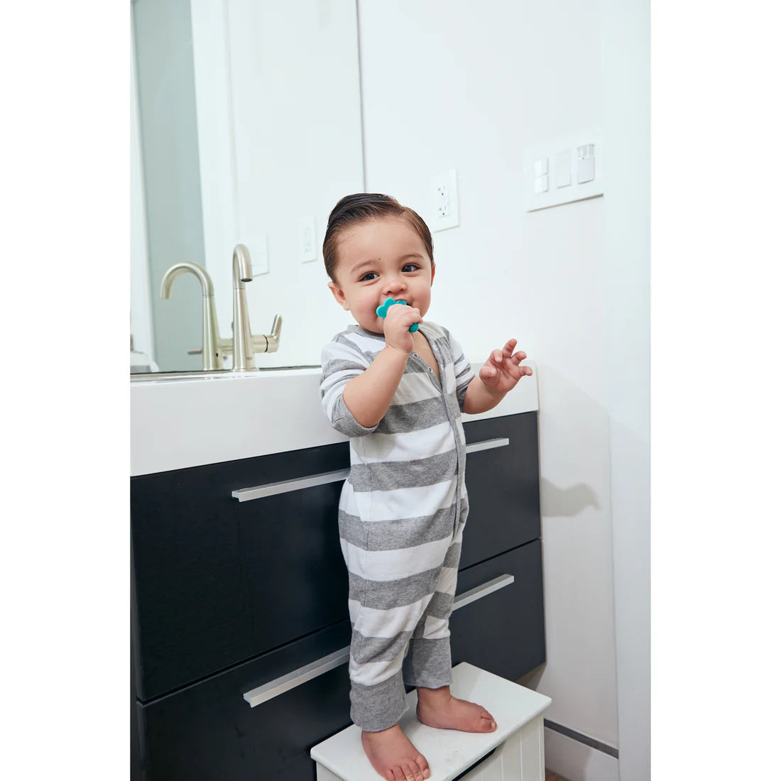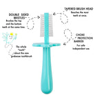 De dubbelzijdige tandenborstel is er voor kinderen van 6 maanden t/m 4 jaar en ontworpen om het poetsen van baby- en peutertanden gemakkelijker te maken voor ouder én kind.