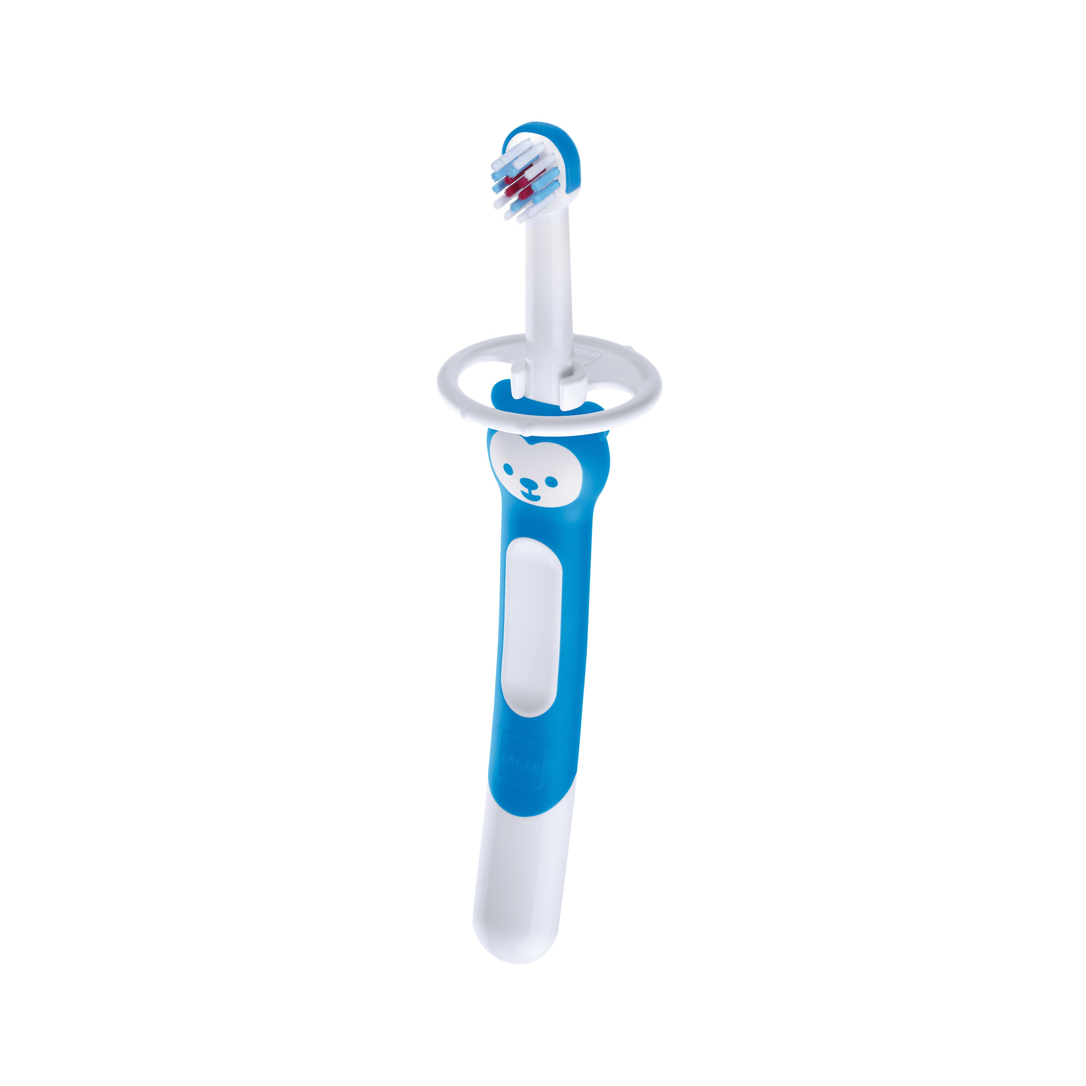 • Stap 1: MAM Training Brush: Met de extra lange greep kunnen ouders en baby samen poetsen. Baby's kunnen worden begeleid door de juiste poetsbewegingen.