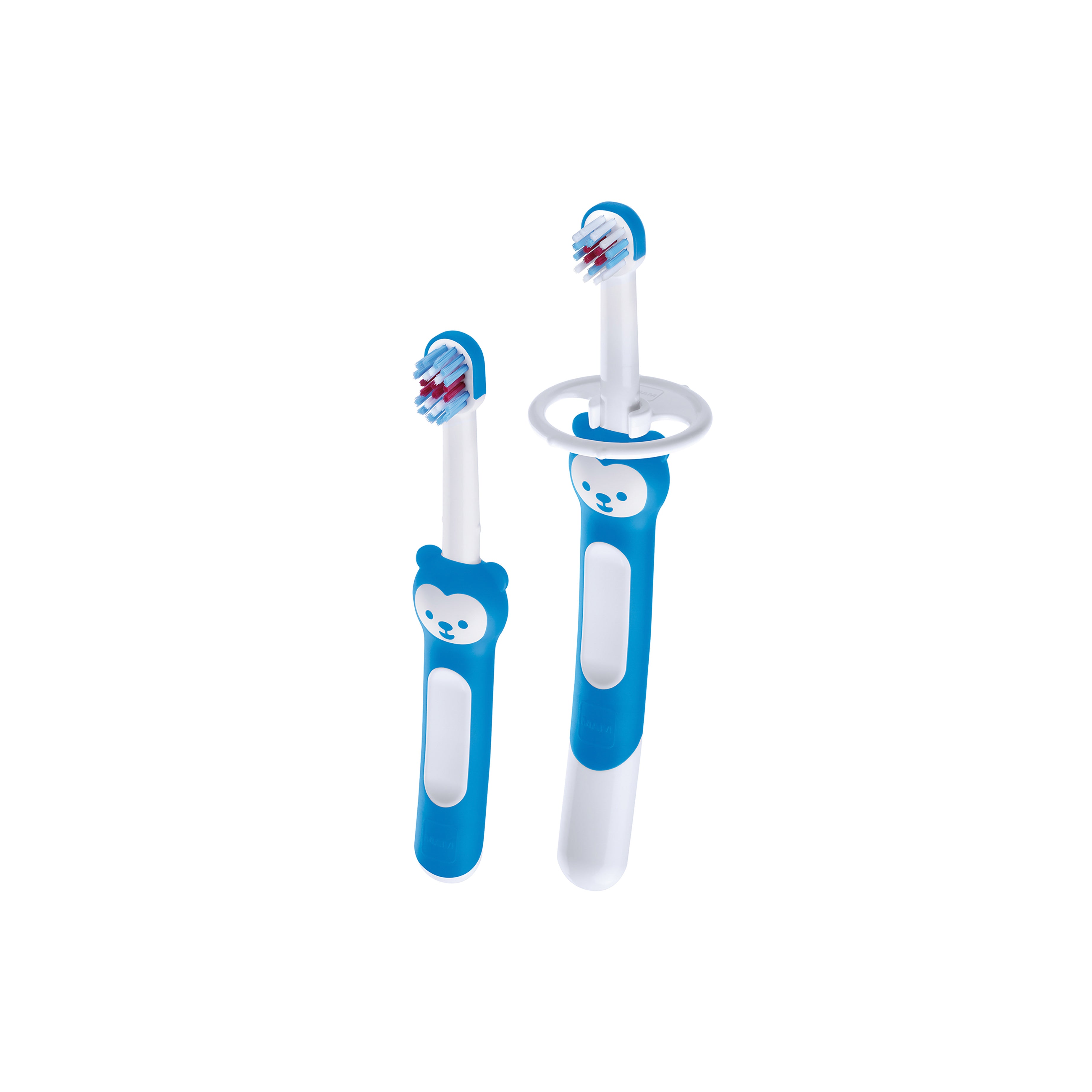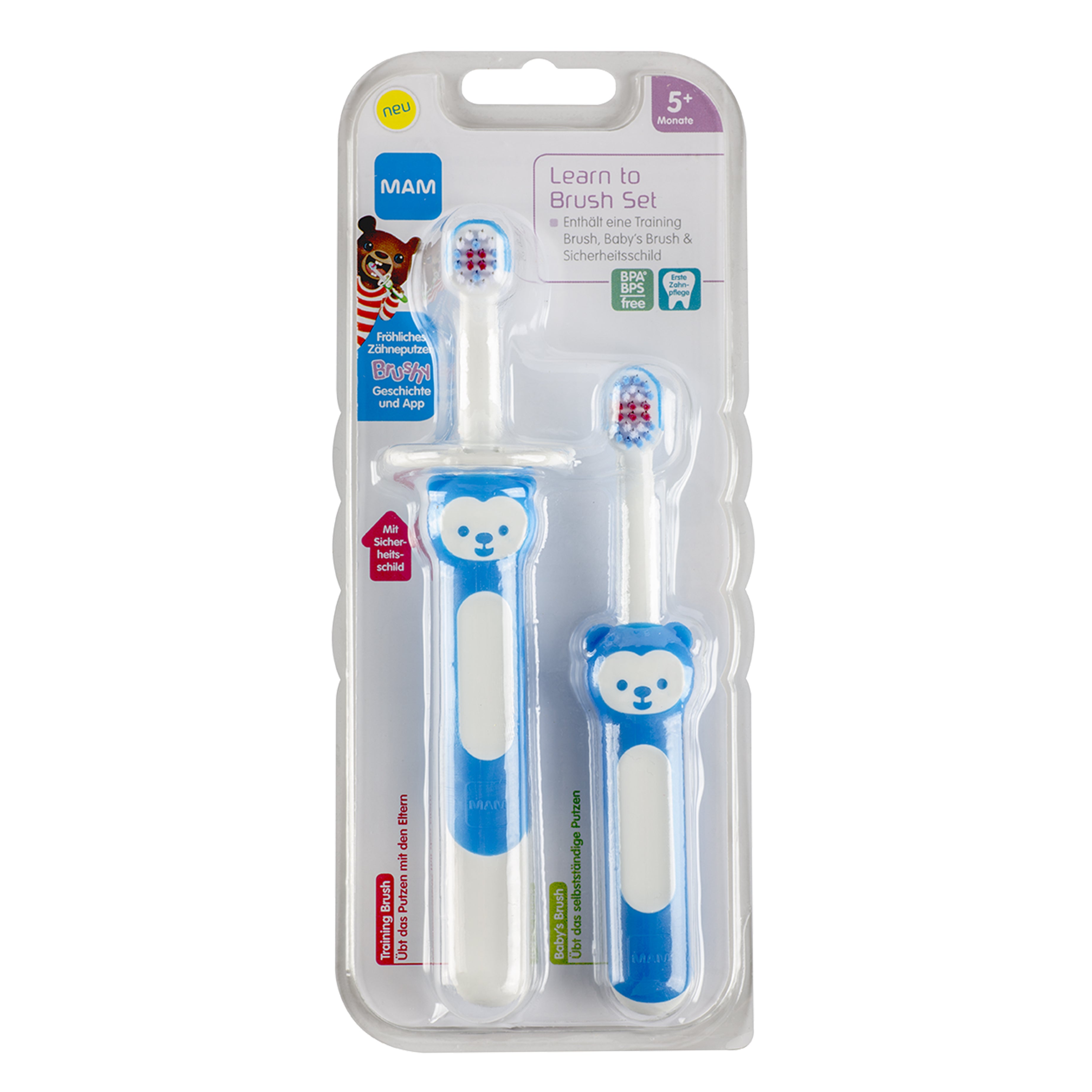 Met de Learn to Brush Set bestaande uit de MAM Training Brush en MAM Baby’s Brush leren baby's hoe ze hun tanden goed moeten poetsen vanaf het begin.