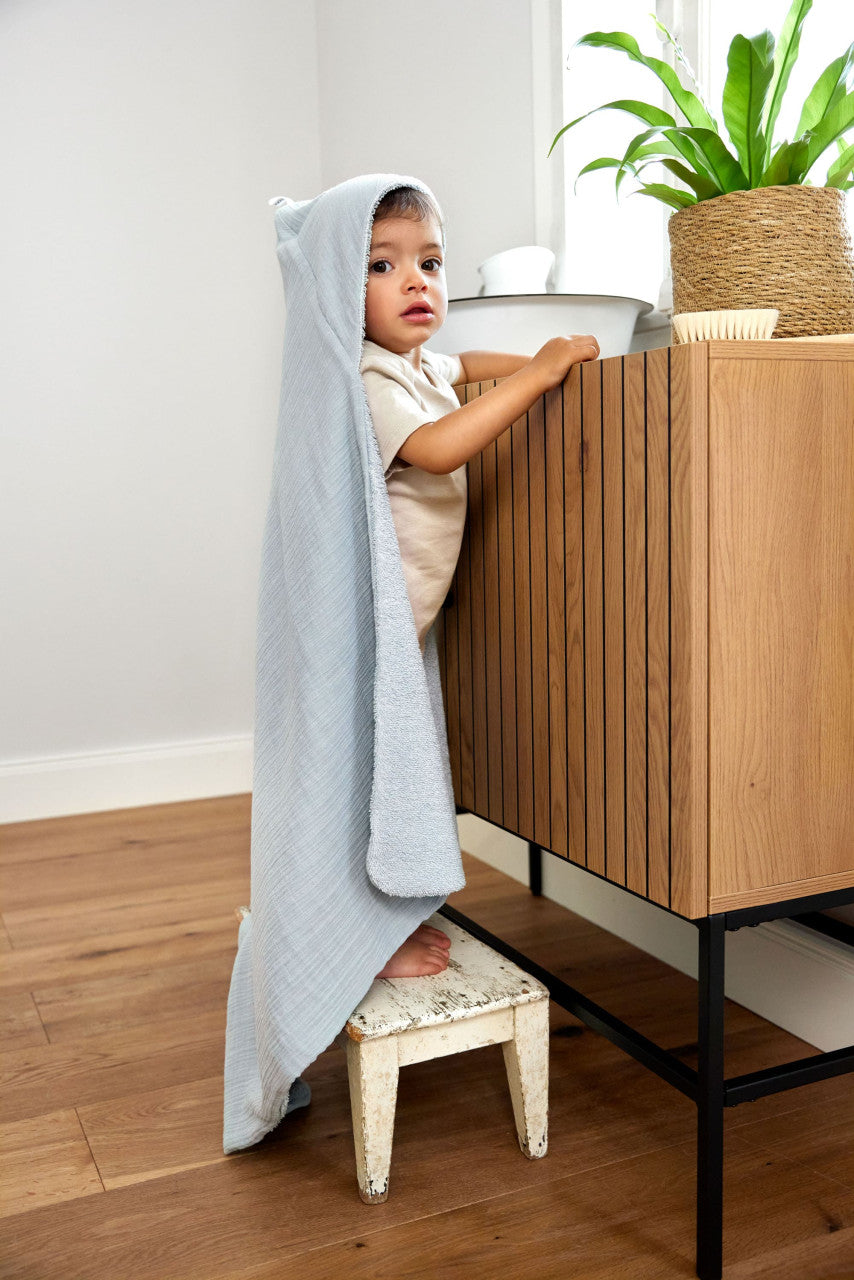 Lässig dubbelzijdige tetra/badstof badcape - powder blue