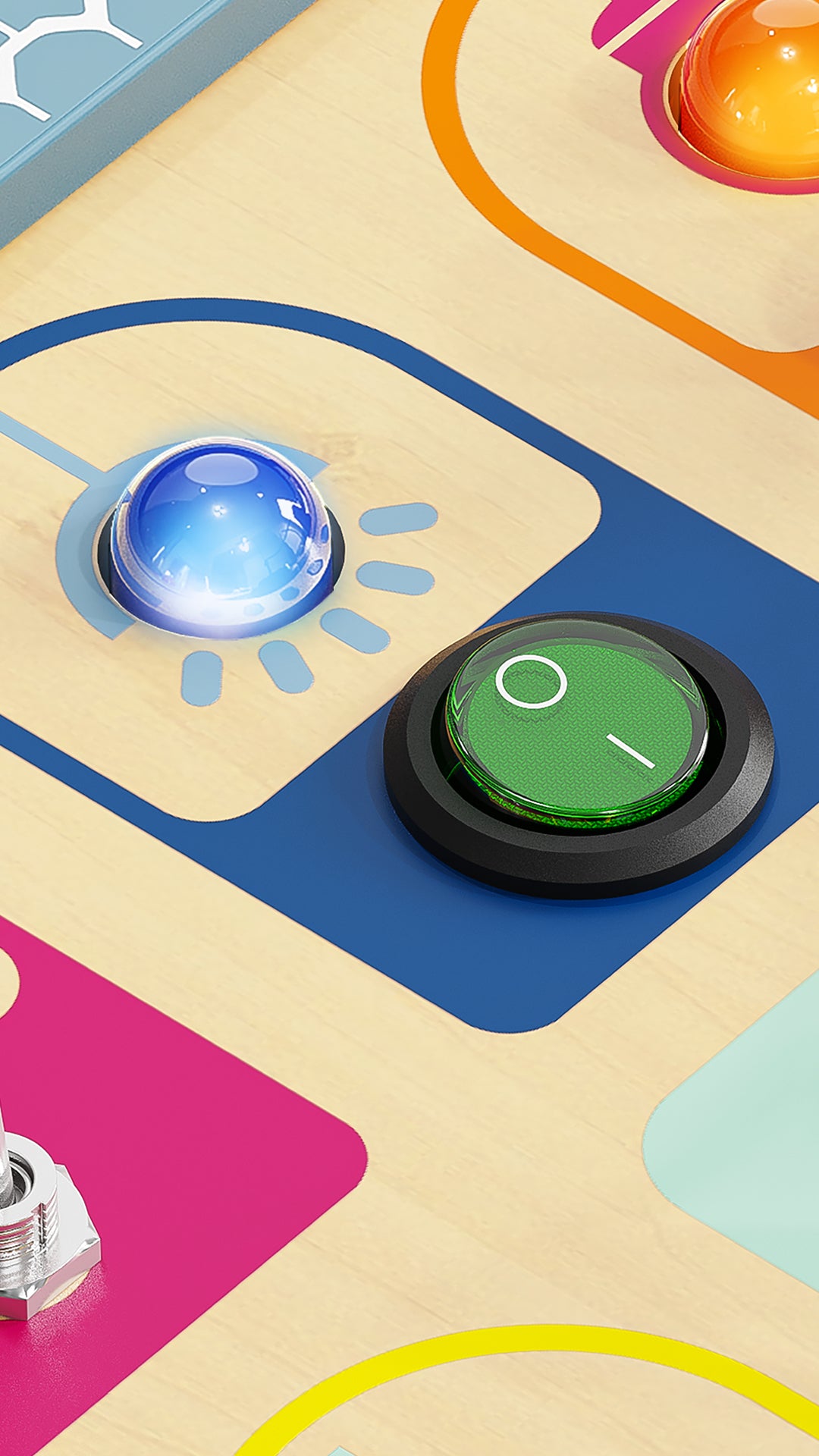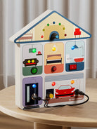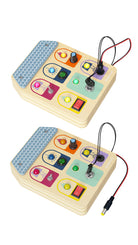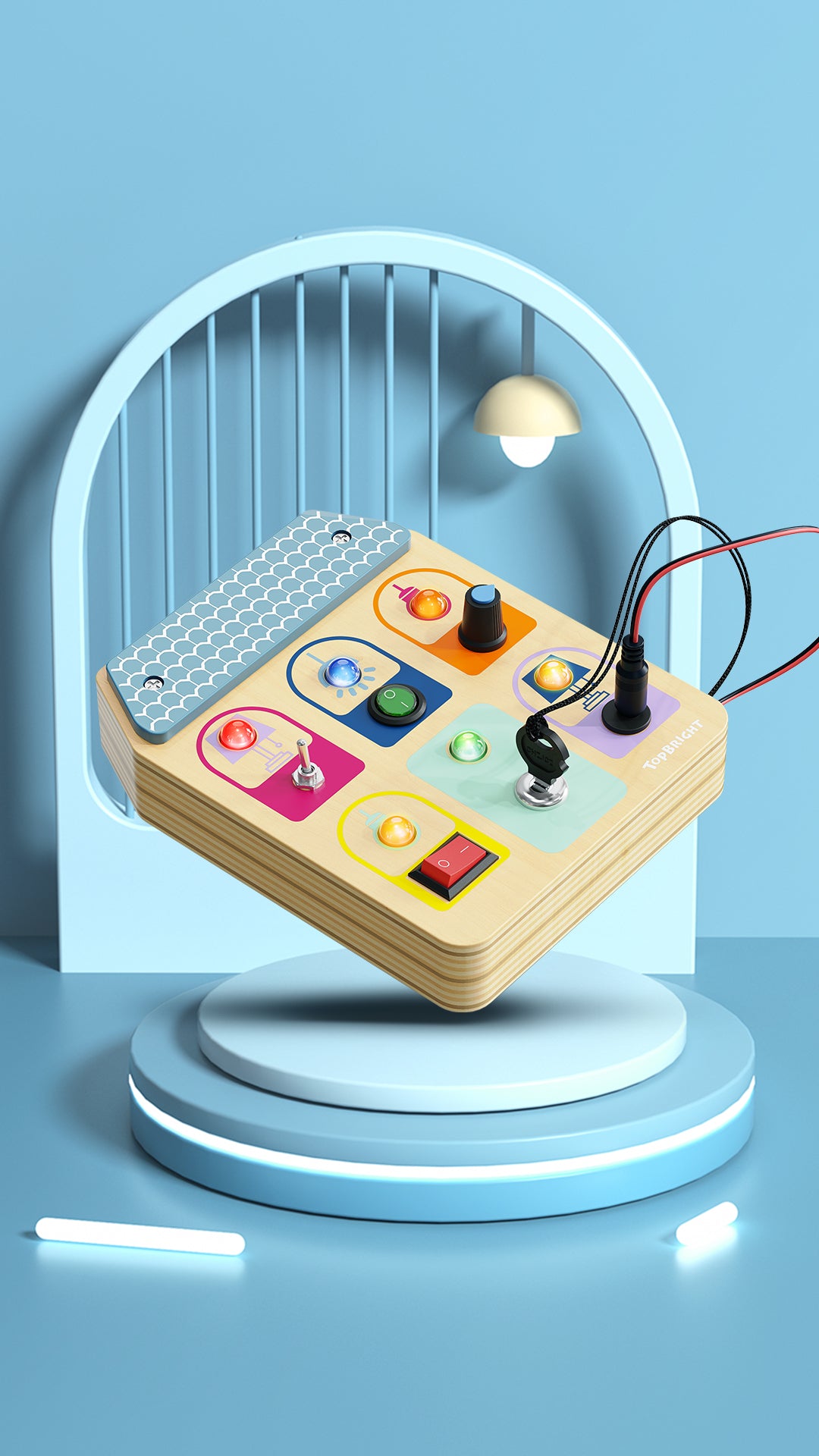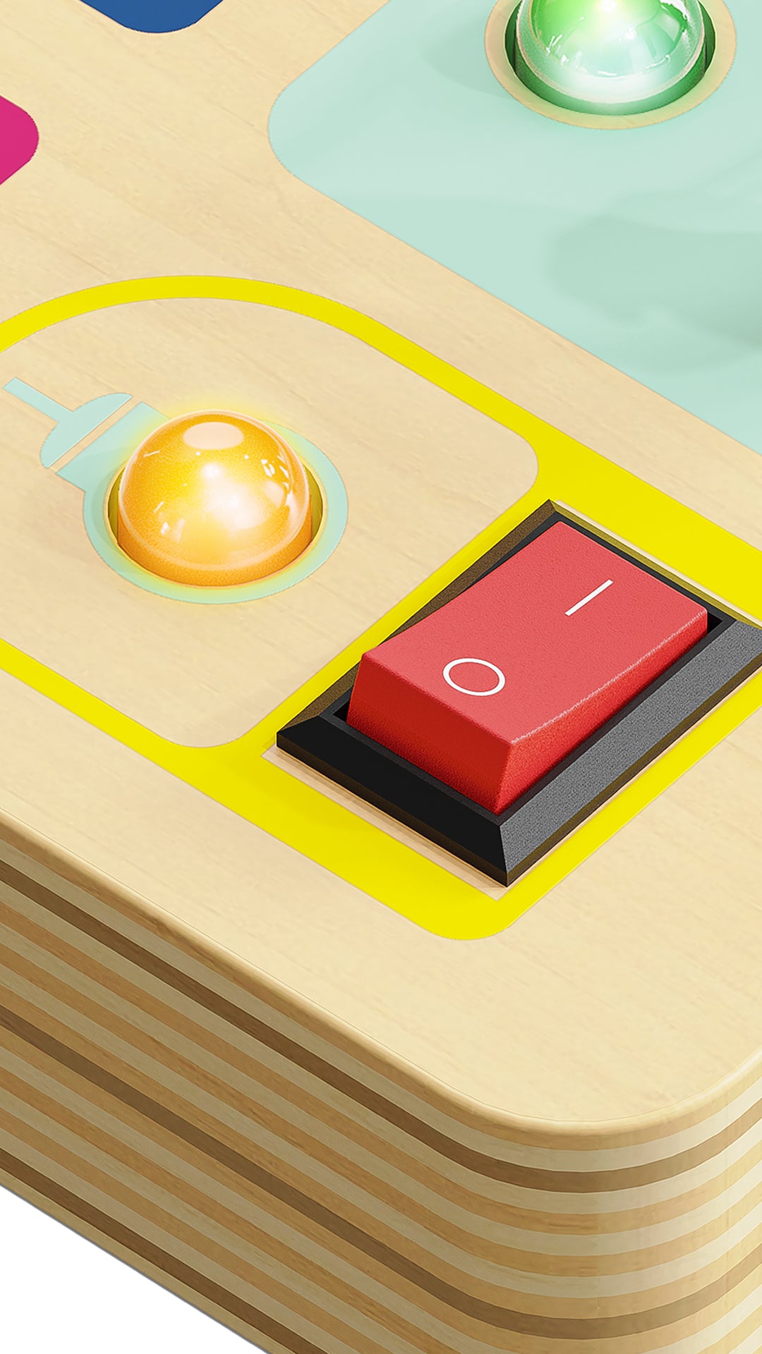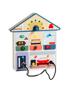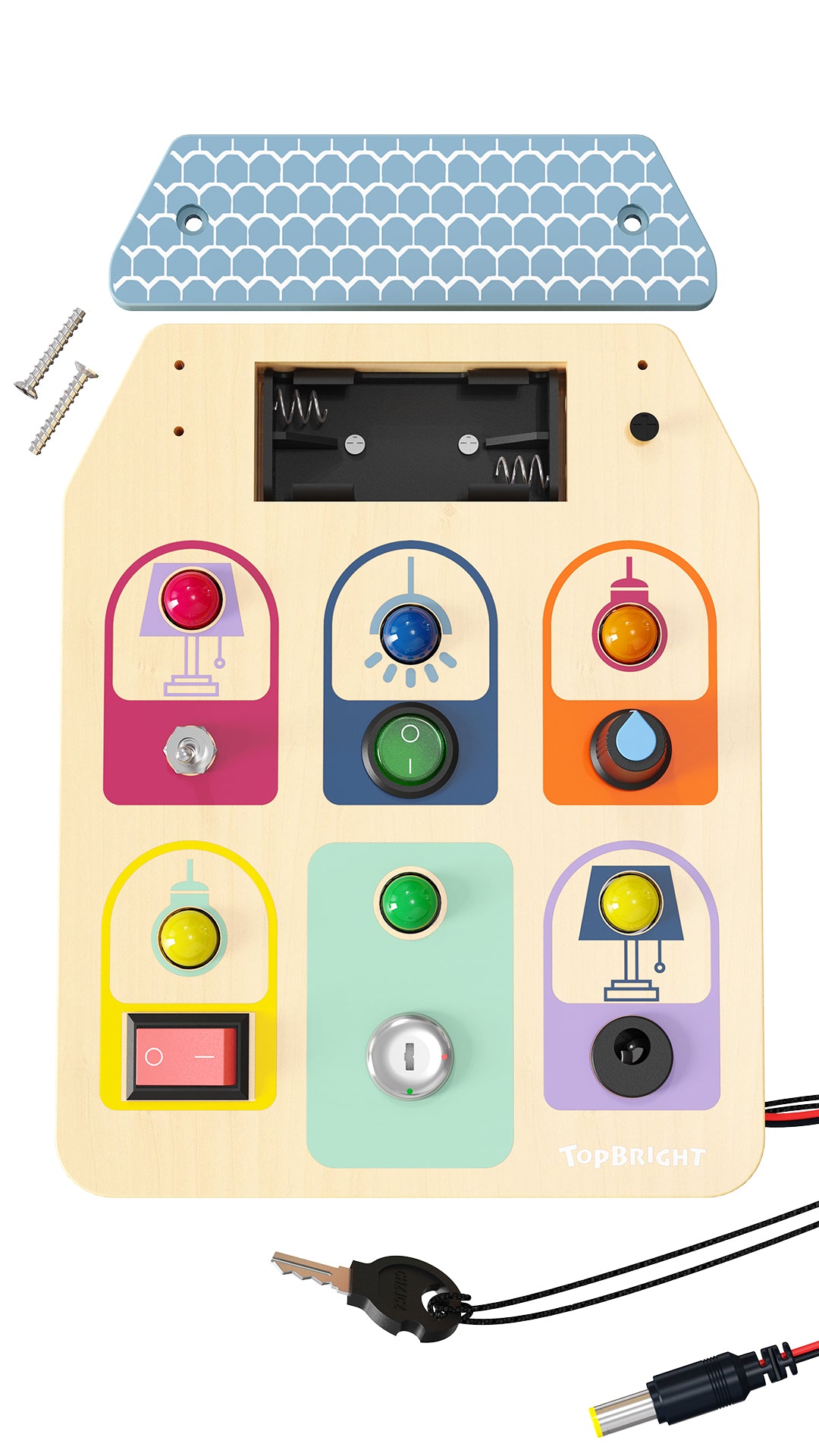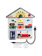 Praktische vaardigheden: Met het Busy Board proberen kinderen vertrouwde dingen uit hun dagelijks leven uit in een veilige omgeving en ontwikkelen ze praktische vaardigheden voor het leven. Ze ontdekken het basisprincipe van elektriciteit en proberen de verschillende schakelaars uit. Wisselschakelaar, drukknop, draaischakelaar, drukknop, sleutelschakelaar, kabelschakelaar - met dit bord leren kinderen over en begrijpen ze allerlei schakelaars. Om de lichten aan te zetten, heeft het bord 2 AAA-1.5V-batterijen nodig, die niet inbegrepen zijn. Deze worden in het dak van het huis geplaatst.