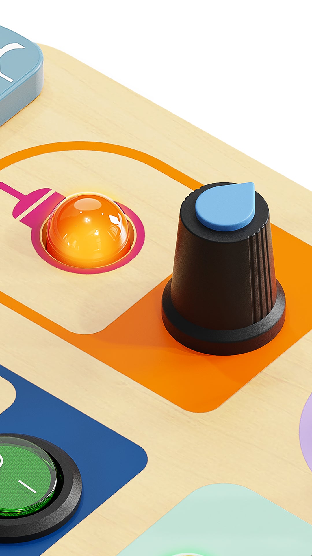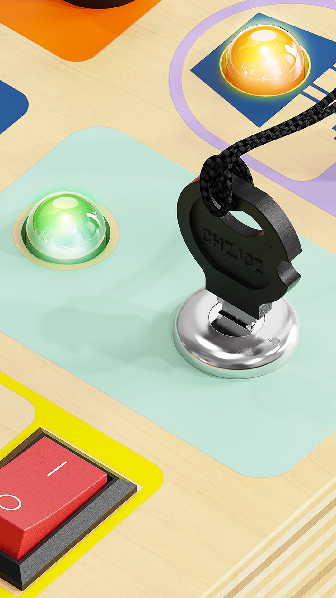 Praktische opslag: De Busy Board Switch overtuigt door zijn compacte formaat. Sleutel- en kabelschakelaars zijn bevestigd aan het huis, waardoor het Busy Board snel opgeborgen kan worden en gemakkelijk te transporteren is. Dit maakt het Busy Board perfect voor onderweg en een goede reisgenoot.