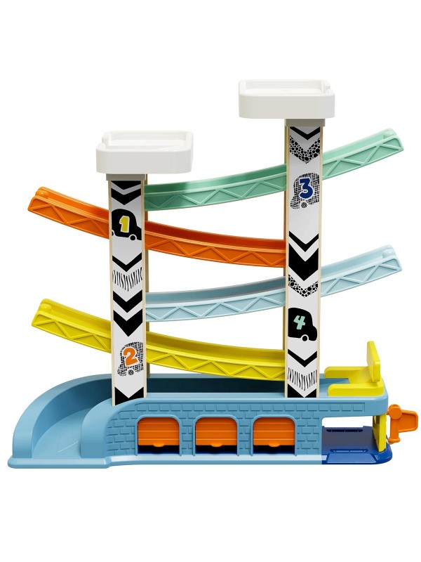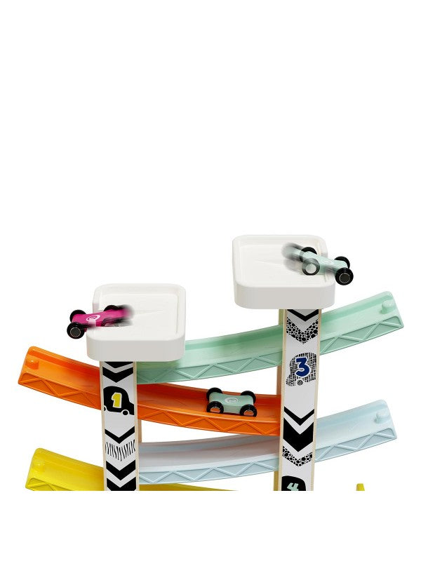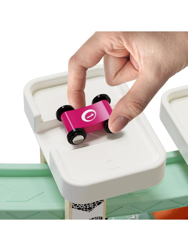 Lichtgewicht, stabiel en coole eigenschappen: Of het nu alleen of met z'n tweeën is, de kleurrijke racebaan stimuleert de fantasie van kinderen en maakt fantasiespel mogelijk. Vier turbosnelle speedsters, vier snelle ramps, drie garages, twee parkeerdekken, een werkplaats met benzinestation - en de autorace-ervaring is compleet. Kinderen gaan creatief aan de slag en bedenken spannende verhalen over de autoracebaan. Zelfs het zoeken naar een parkeerplaats is een fluitje van een cent: als het spel is afgelopen, vinden de kleine racers hun plaats op de twee parkeerdekken. Dit zorgt voor orde in de kinderkamer - en een snelle start van de volgende race.