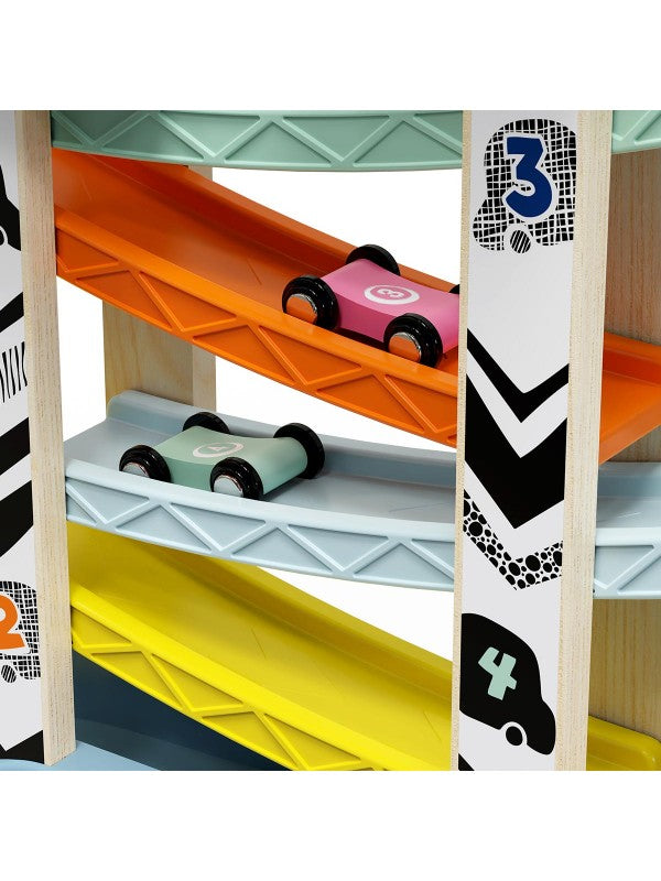 Trendy unisekskleuren moedigen meisjes en jongens aan om te spelen, grijpen en ontdekken. De racebaan is gemaakt van natuurlijk hout en hoogwaardig kunststof. Omdat kinderen de wereld met al hun zintuigen ontdekken, is het hout behandeld met verf op waterbasis. Tijdloze patronen in contrasterende zwart-wittinten op de autoracebaan stimuleren de visuele ontwikkeling en fascineren zelfs de jongste kinderen. De kleurrijke houten auto's hebben ook het ideale formaat voor kleine kinderhanden.