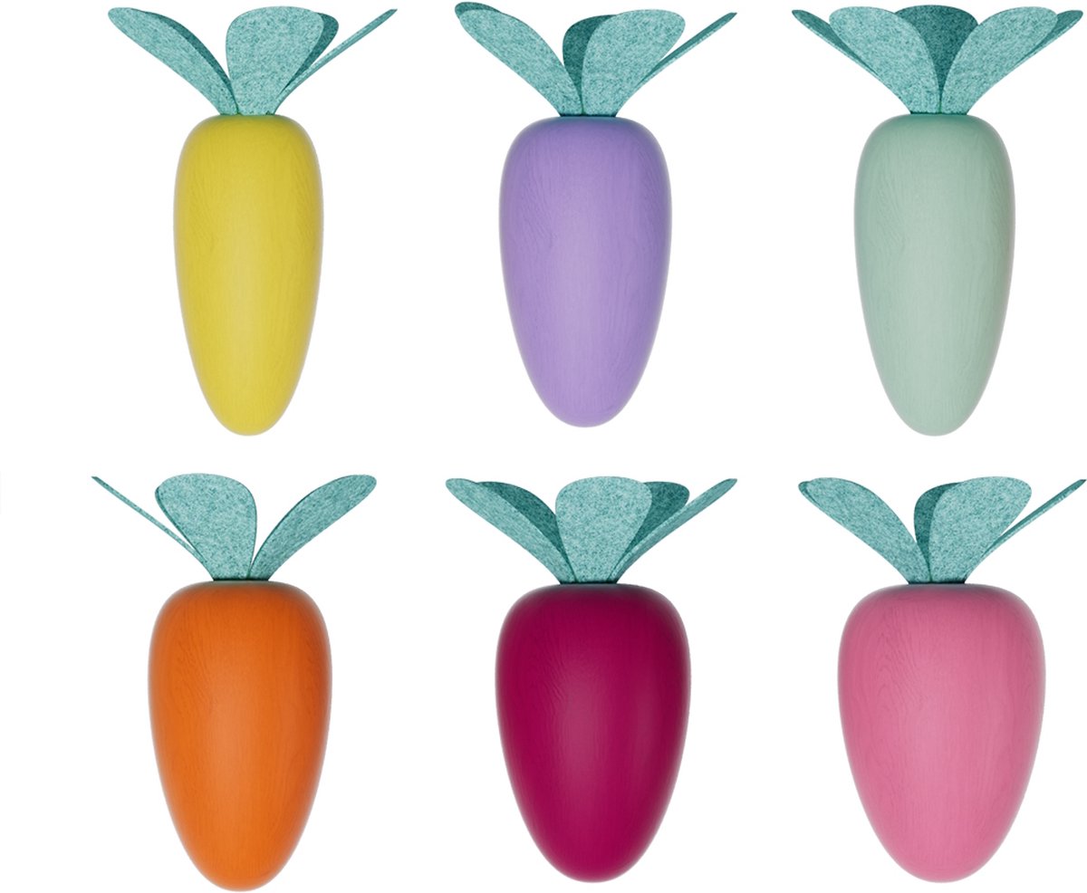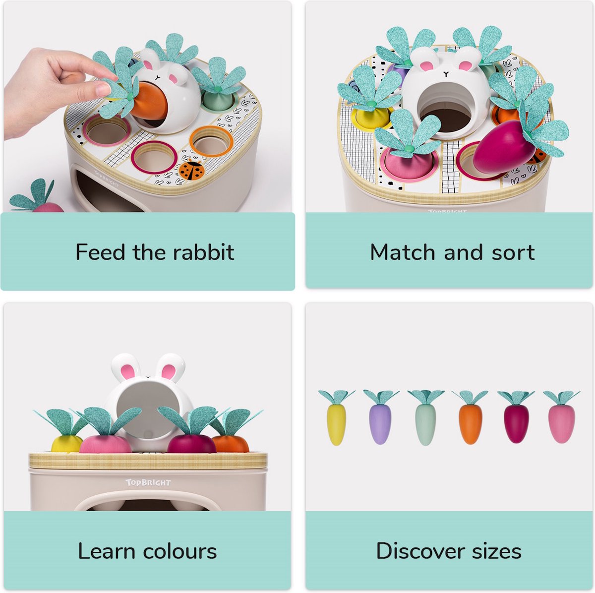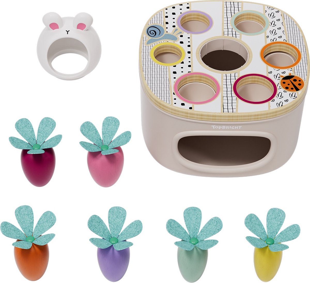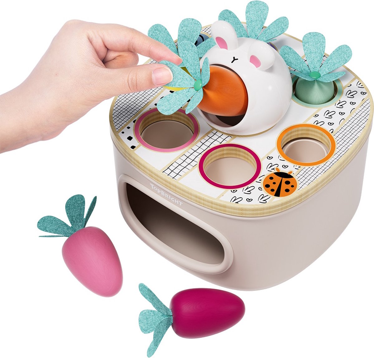 In welk gat past alleen de lange blauwe wortel? Match & Sort Carrots by TOPBRIGHT collectie bestaat uit een robuuste doos van wit plastic met een houten deksel met gaten van verschillende dieptes en breedtes. Slimme kinderen sorteren nu de wortels van verschillende lengtes en diktes in felle kleuren in de bijpassende gaten. Gekleurde ringen rond de gaatjes helpen kinderen om het juiste gaatje te vinden. In het midden van de doos bevindt zich ook een hongerige konijnenkop met zijn bek wijd open. Kinderen voeren het konijn op een slimme manier met de kleurrijke wortels en imiteren de rol van de ouders. Of het nu dik of dun, blauw of geel is: de kleintjes leren over kleuren met het sorteerspel, oudere kinderen wijzen de wortelen correct toe aan de gaten met verschillende dieptes, afhankelijk van hun grootte. Daarbij trainen ze de fijne motoriek, hand-oogcoördinatie en logisch denken.