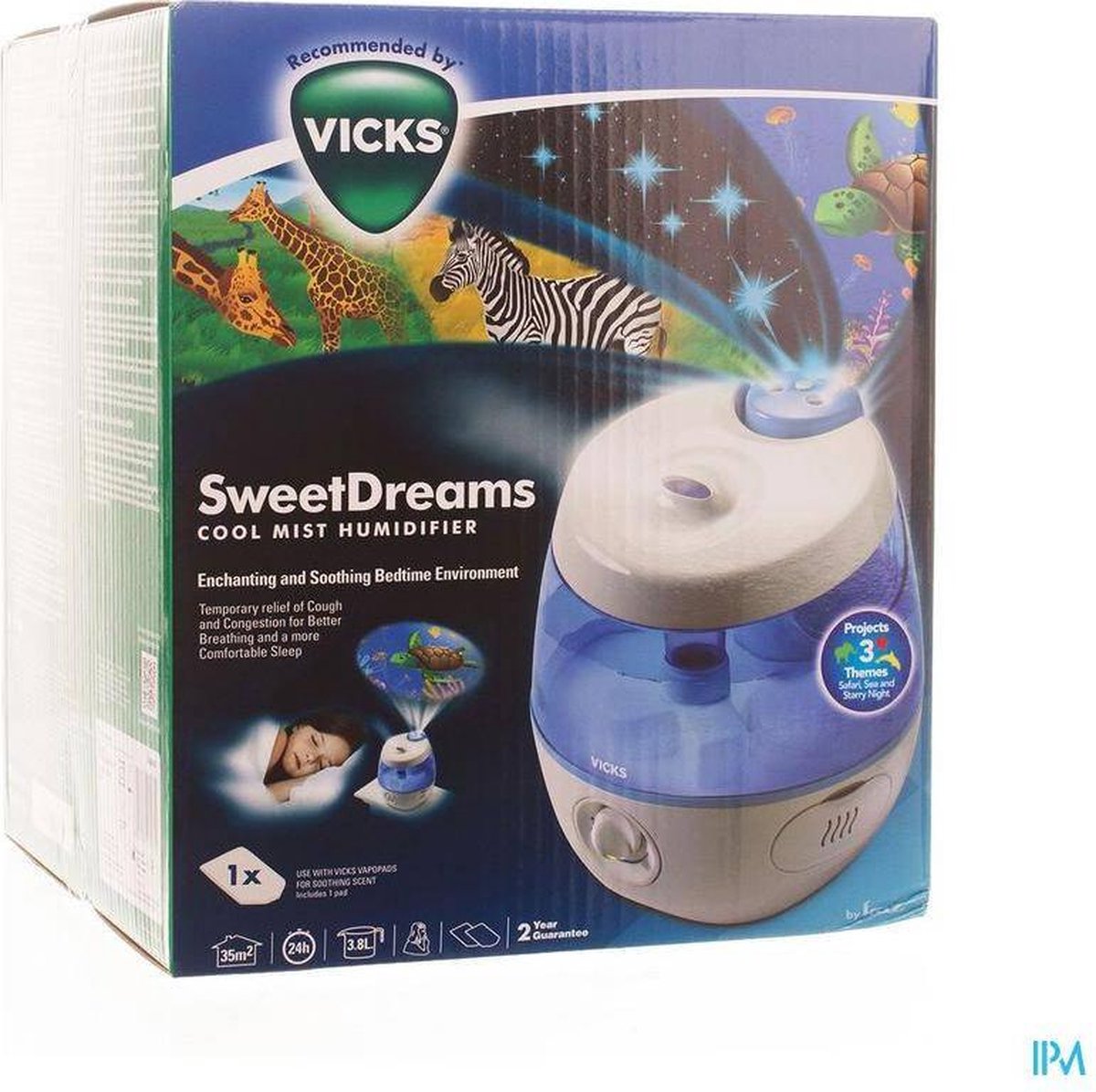 De Vicks Sweetdreams Cool Mist ultrasone luchtbevochtiger kan een oppervlakte van 35m² bevochtigen en tovert met 3 sets van 3 droomafbeeldingen op uw kind zijn slaapkamer.