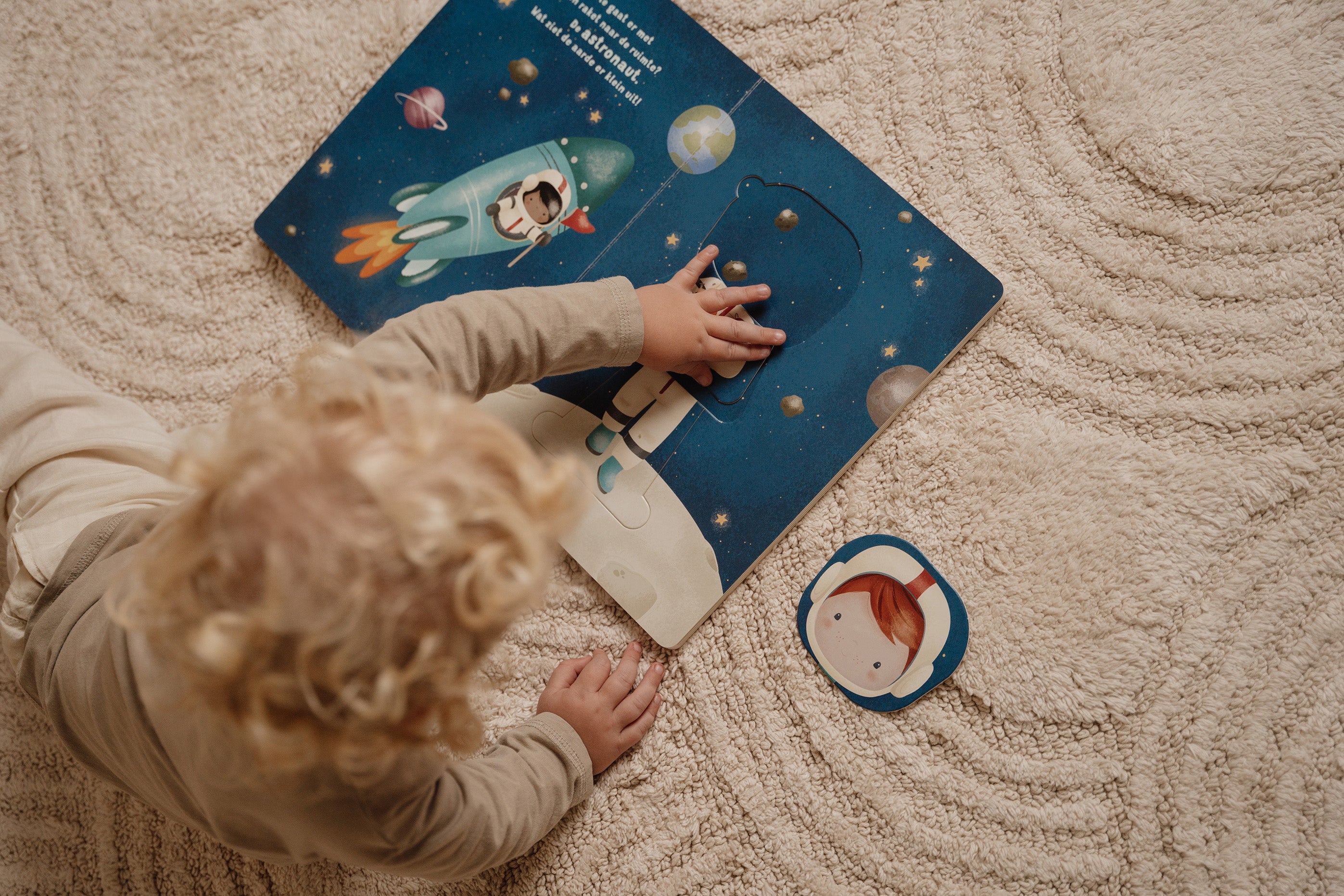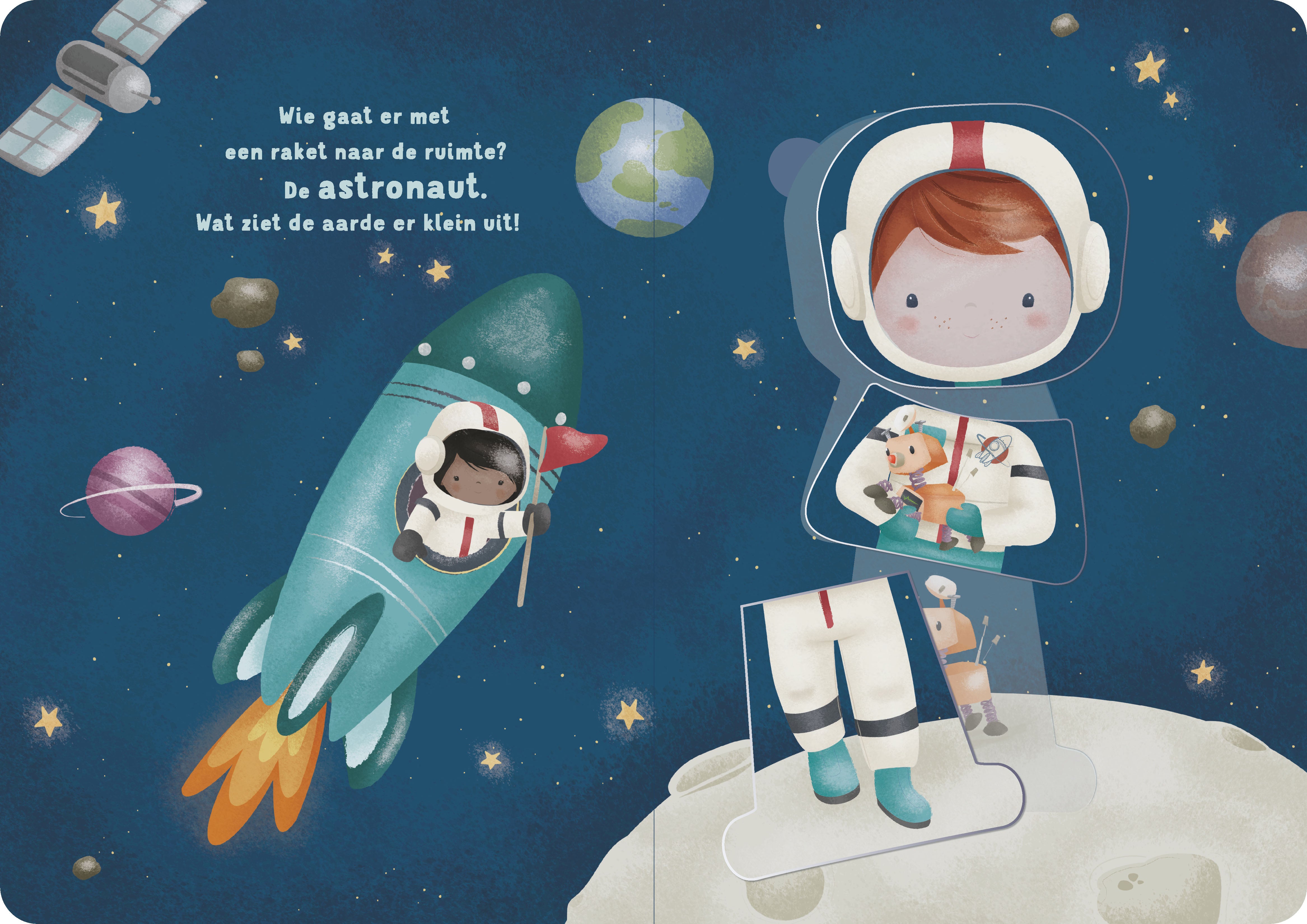 Er staan allerlei leuke beroepen in dit boek. De duiker onderzoekt de zeebodem. De bloemist verkoopt mooie bloemen. En de astronaut is met een raket naar de maan gevlogen. Wat wil jij later worden?