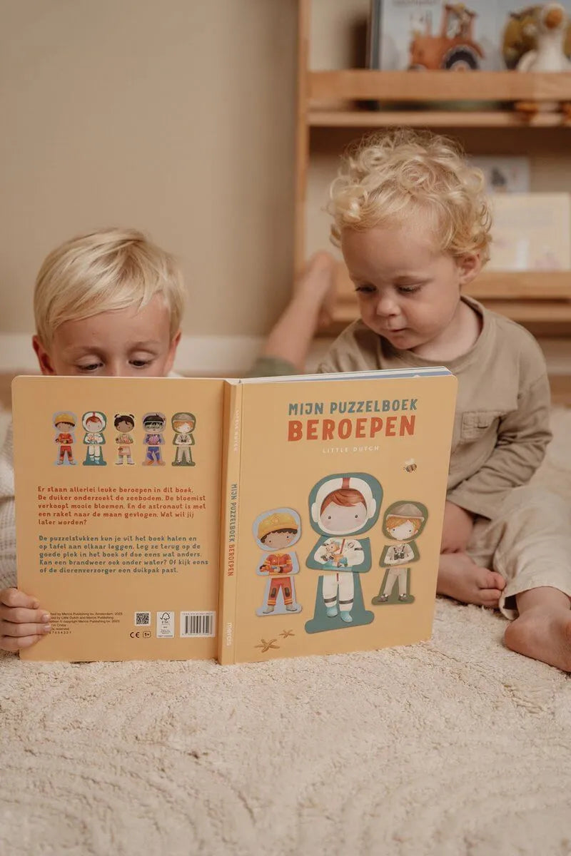 De puzzelstukken kun je uit het boek halen en op tafel aan elkaar leggen. Leg ze terug op de goede plek in het boek of die eens wat anders. Kan een brandweer ook onder water? Of kijk eens of de dierenverzorger een duikpak past.